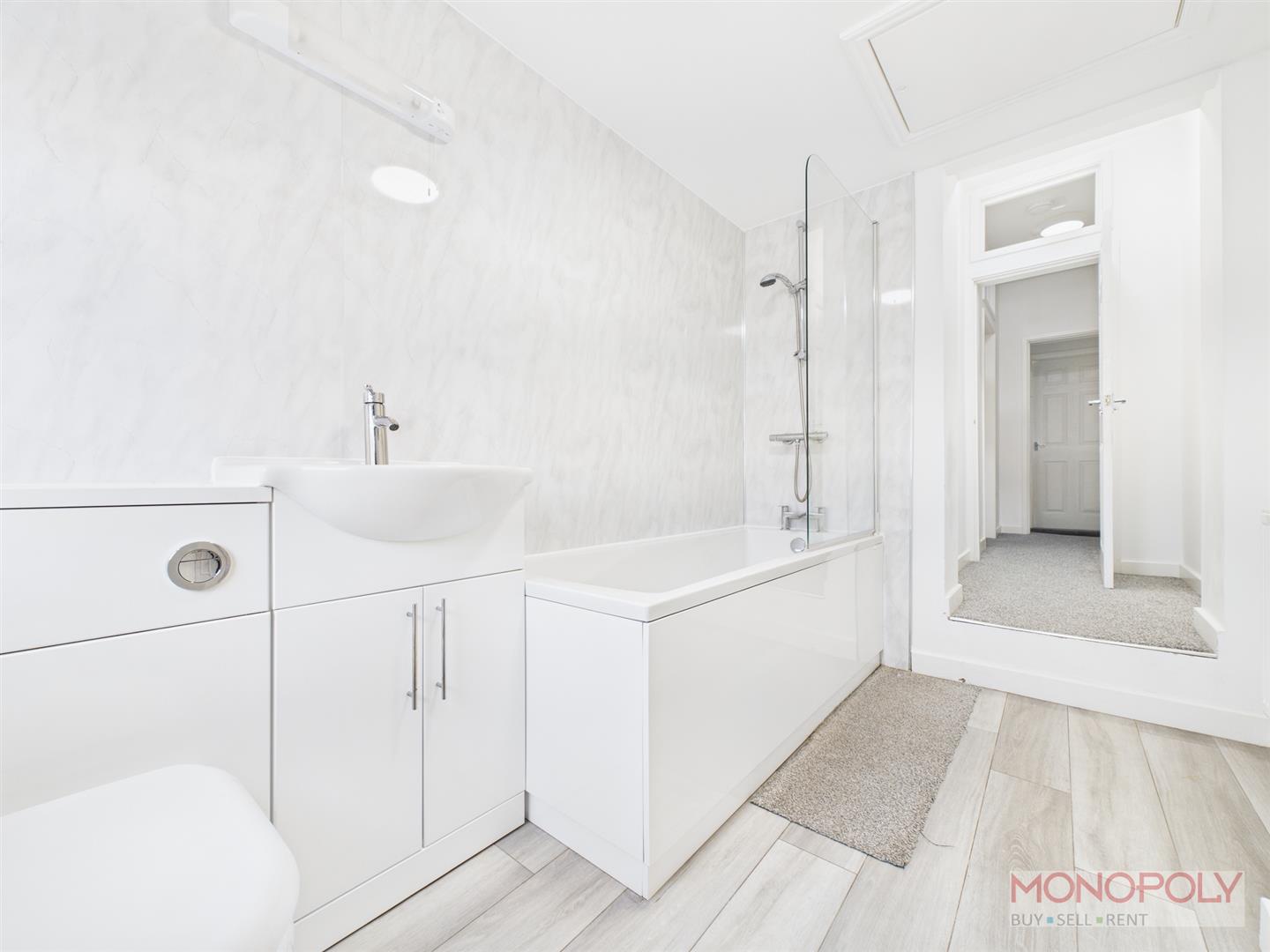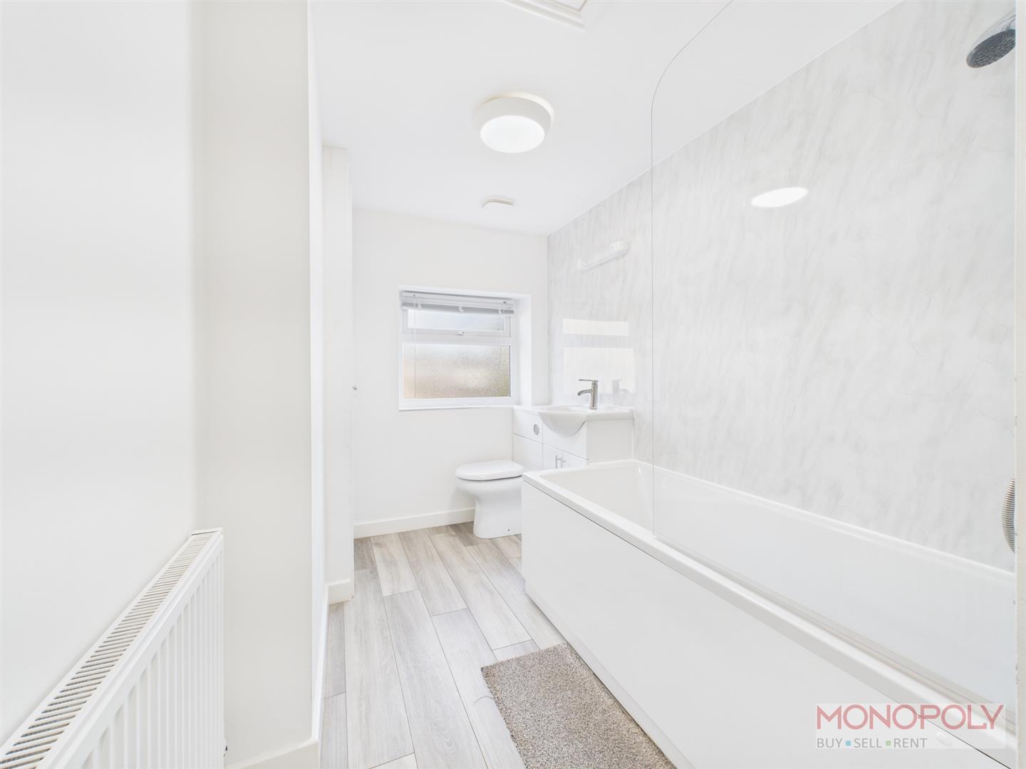 A modern bathroom comprising a white three-piece suite including low-level w.c with concealed cistern, wash hand basin with vanity unit under, bath with thermostatic shower over, door to cupboard housing Ideal Gas Combination boiler, wood effect flooring, 'easy clean' wall panelling, uPVC Double glazed window to the rear.