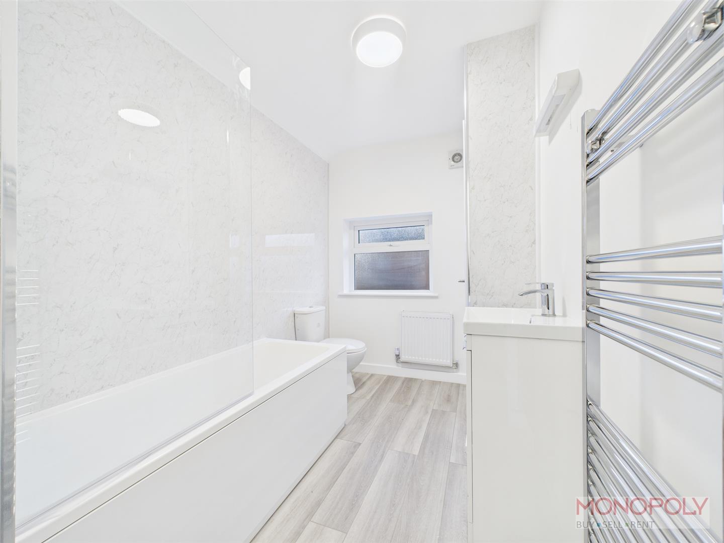 Newly fitted modern three-piece bathroom with low-level WC, wash hand basin with storage under and panelled bath with mains shower over. LVT flooring, access to loft, wall light with shave point, ceiling light point, cupboard housing combination boiler and shelving, heated towel rail and panelled radiator, extractor and uPVC double glazed frosted window to the rear elevation.