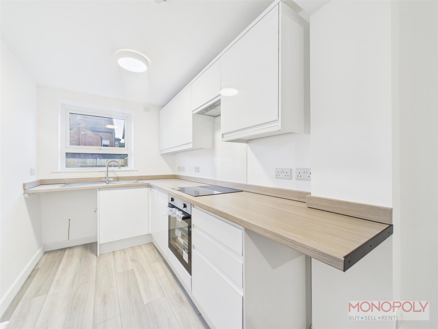 Newly fitted modern kitchen housing a range of wall, drawer and base units with complimentary work surface over. Integrated appliances to include electric oven, hob and extractor. Space for further appliances to include washing machine and fridge-freezer. Stainless steel sink unit with mixer tap over. Ceiling light point, panelled radiator, LVT flooring, uPVC double glazed window to rear and uPVC double glazed door to rear garden.