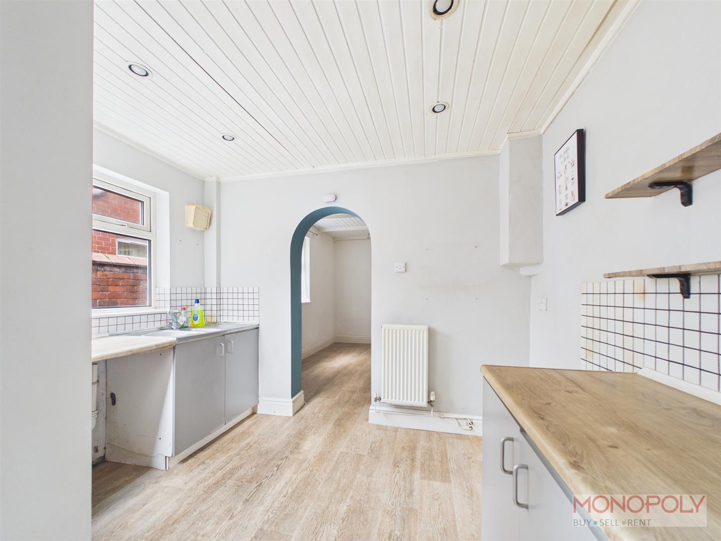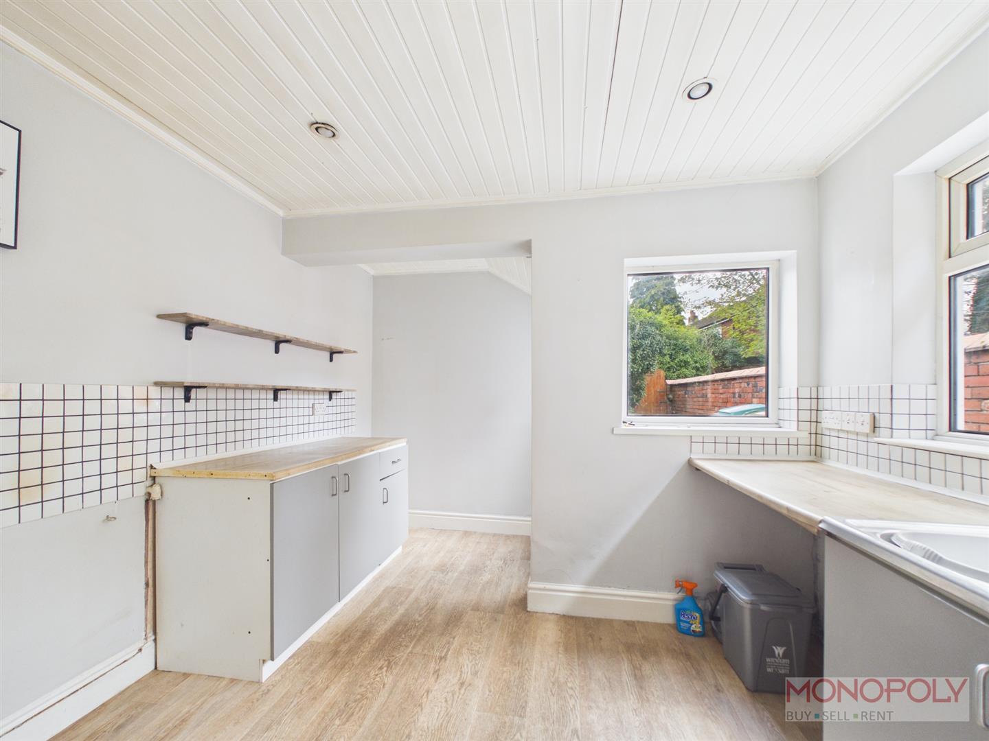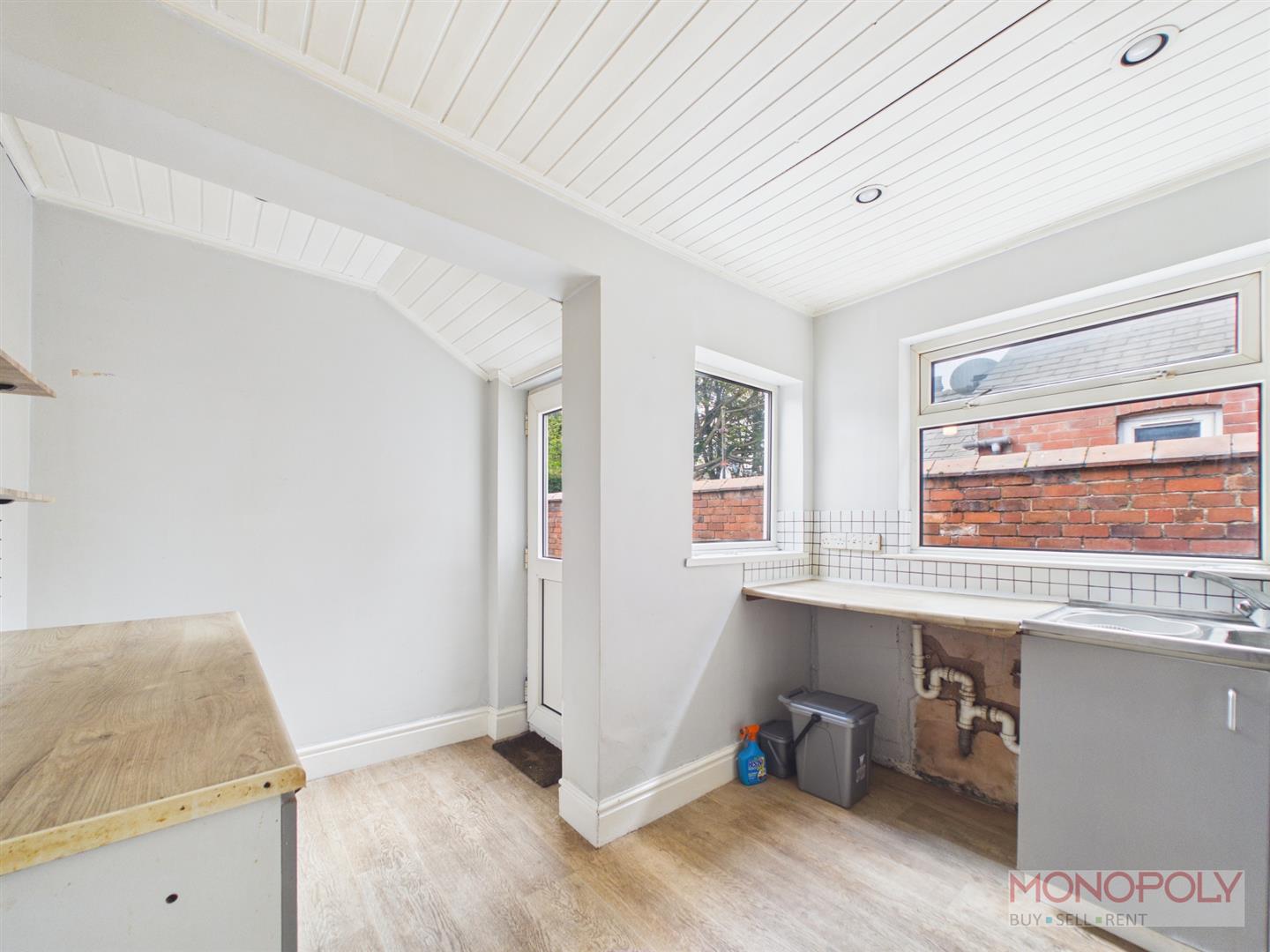 Fitted with base units, working surface with inset stainless steel sink and drainer, 2 double glazed windows, door off to the rear garden, wood effect flooring.