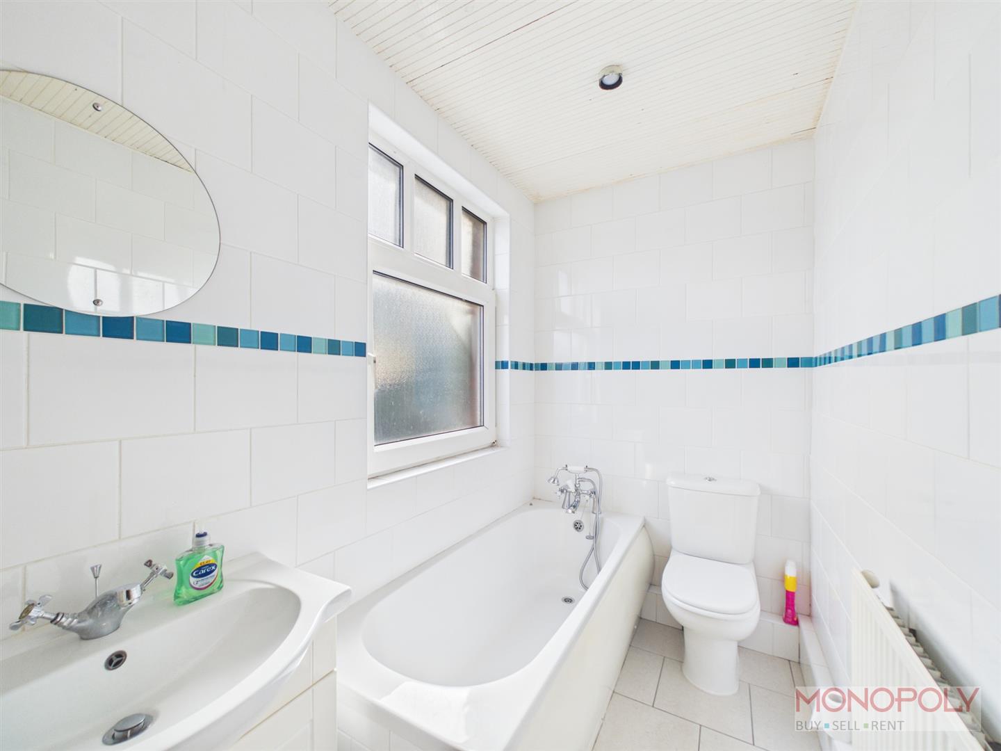 Fitted with a low level w.c, wash hand basin with vanity unit under, bath with shower head attachment, double glazed window, fully tiled walls, tiled flooring, cupboard housing the hot water tank.