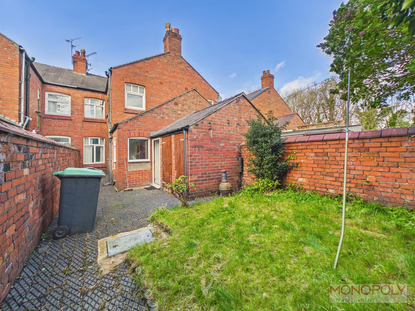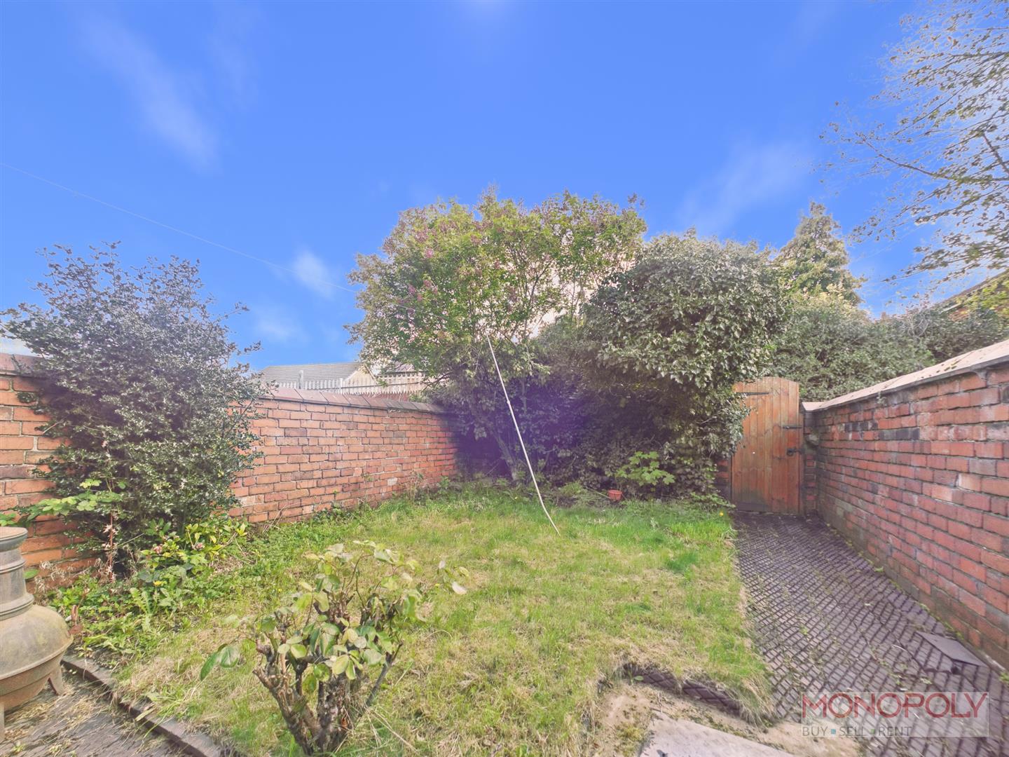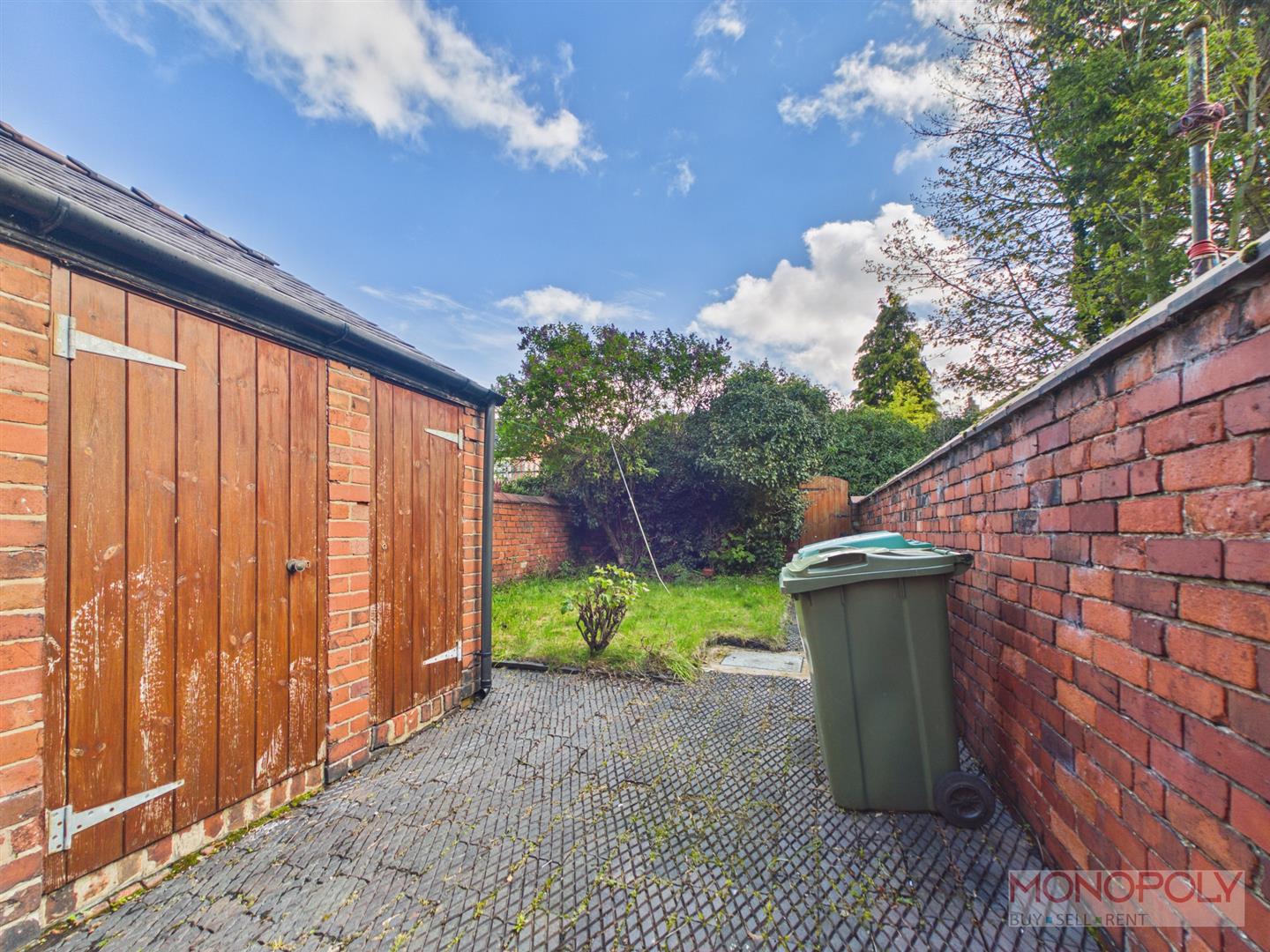 To the rear is a paved area leading on to a lawned garden with gated access to the rear. There is also access to two useful outside stores.