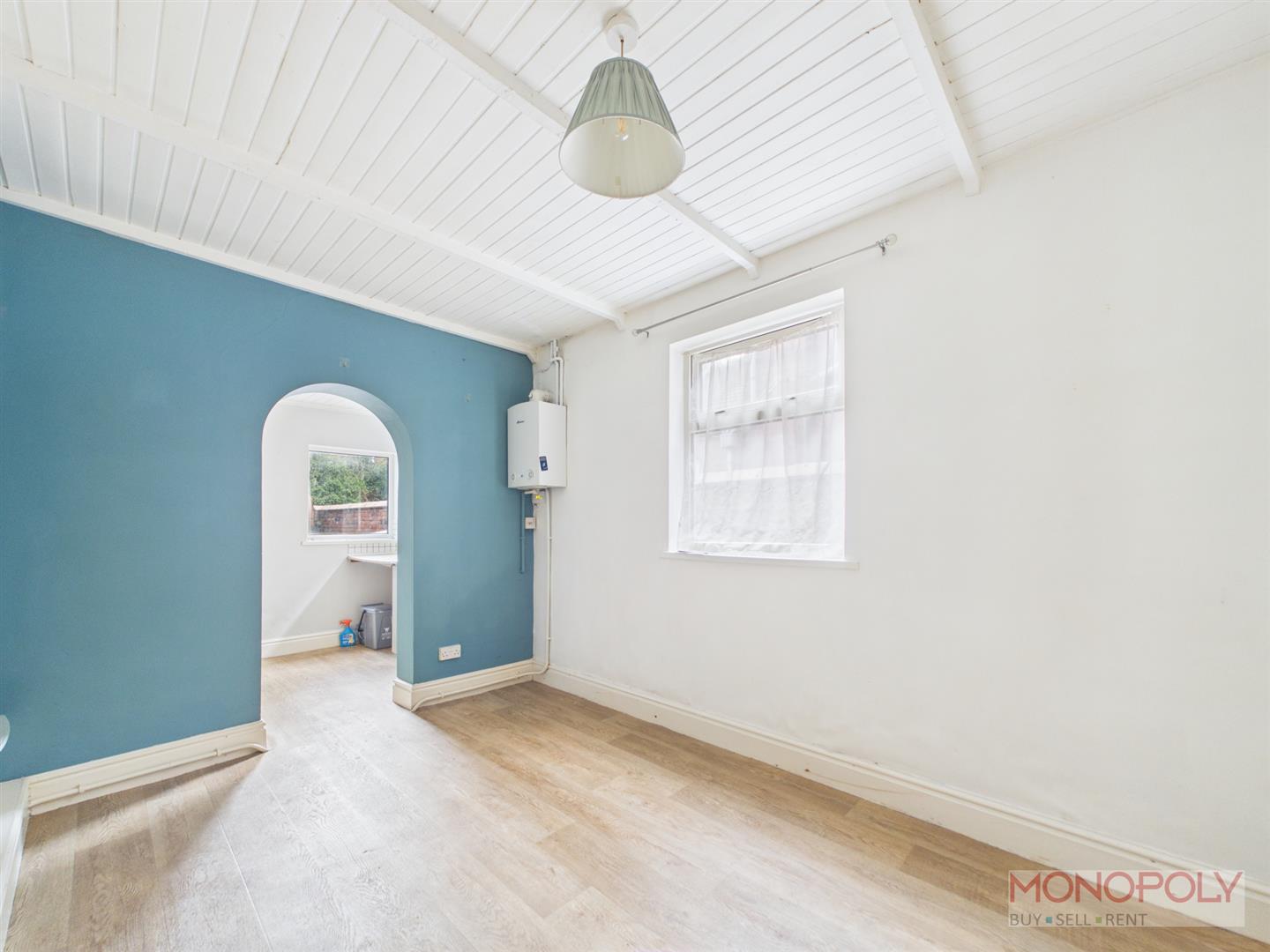 With wood effect flooring, double glazed window to the side, wall mounted gas boiler.
