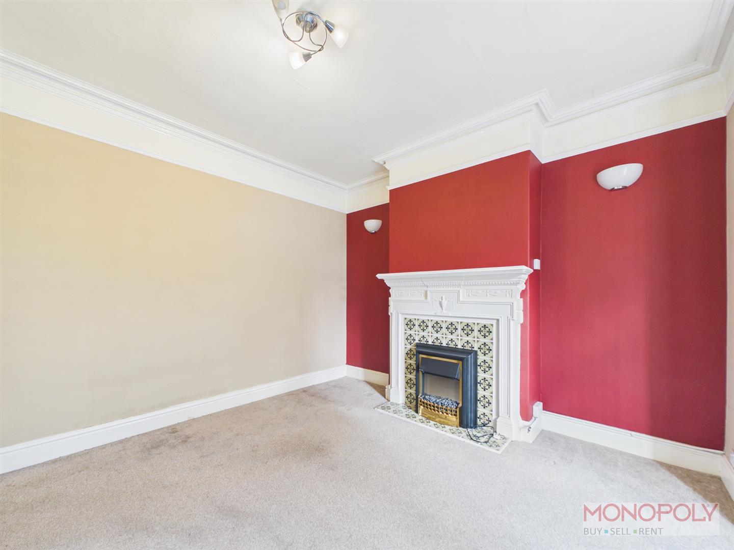 With a large double glazed window to the front, ornate feature fireplace with tiled surround and hearth, high ceilings, carpeted flooring.