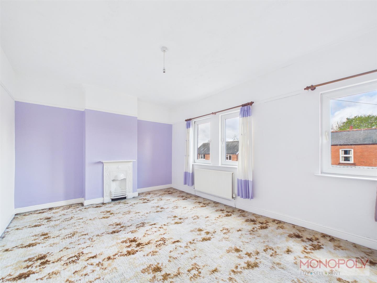 A spacious bedroom with 2 double glazed windows to the front, carpeted flooring, feature cast iron fireplace.