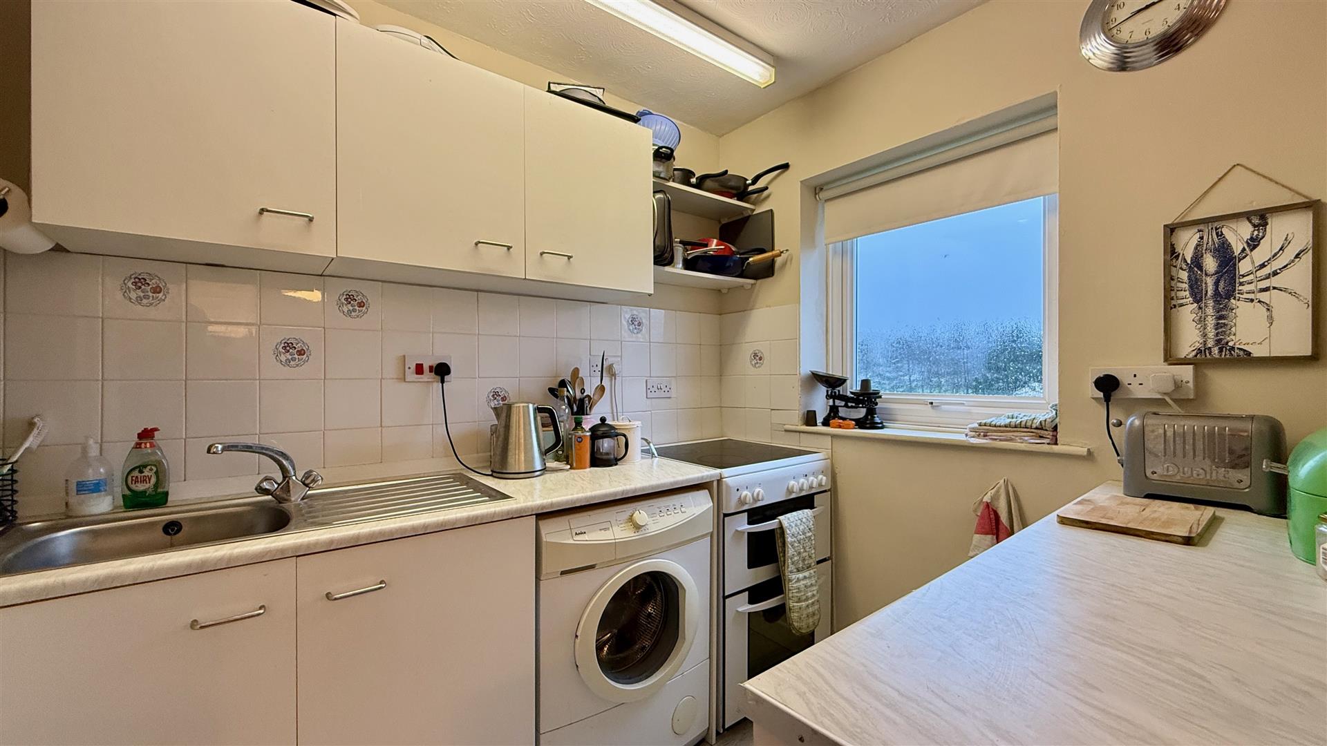 Also benefiting from castle views, the kitchen area has a range of wall and base units with counter over. With stainless steel sink and drainer, space for cooker, space for fridge, plumbing and space for washing machine, newly laid vinyl flooring and cupboard housing the hot water cylinder.