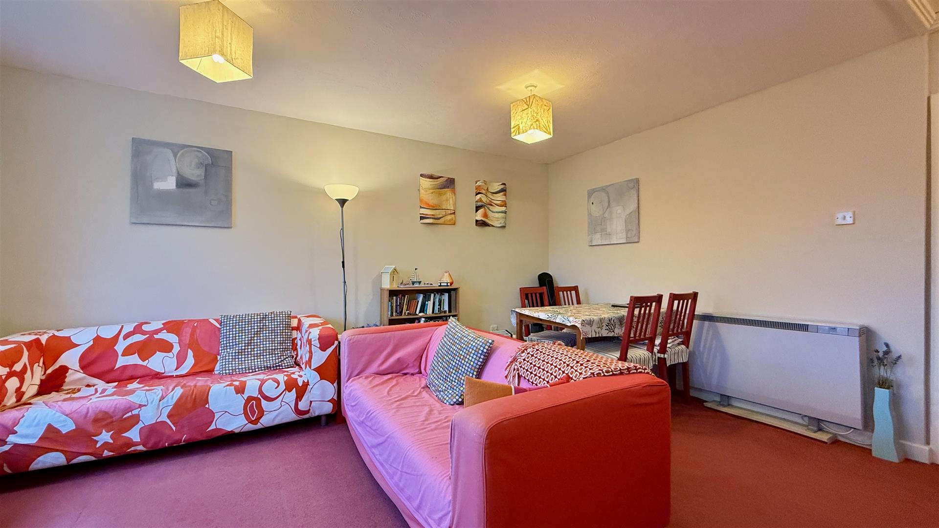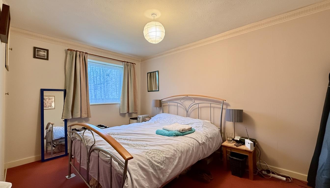 The private entrance door opens to the hallway where there is a large under stairs cupboard with light, doors off to the two double bedrooms and the bathroom. Stairs rise to the second floor.