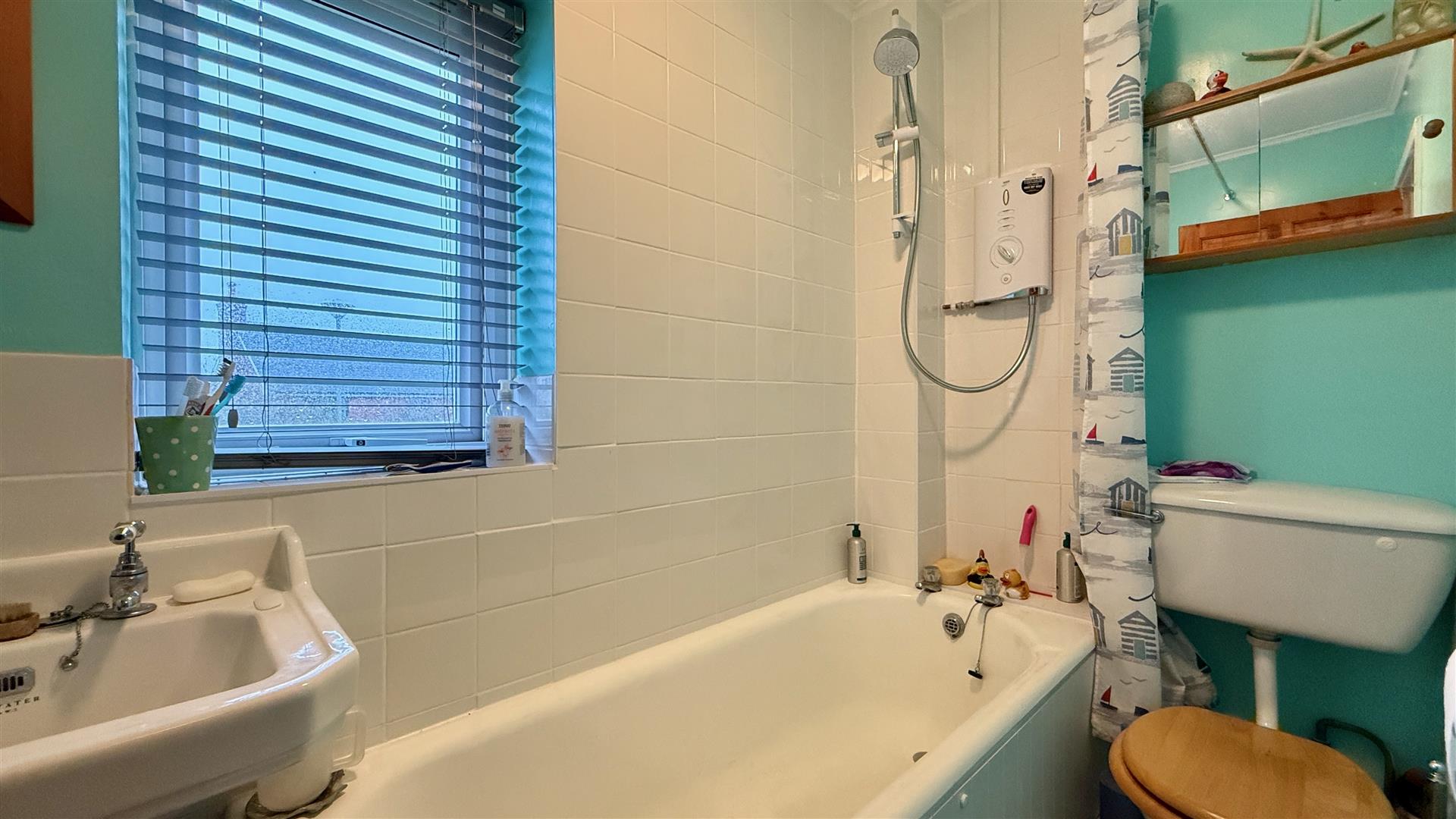 With white suite comprising of bath with shower over, large hand basin and low level WC. Heated towel rail, newly laid vinyl carpet and obscure window.