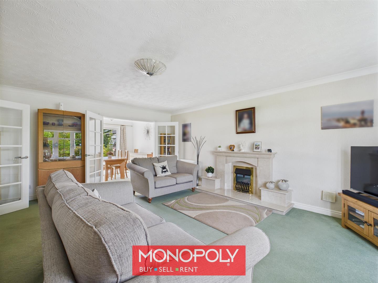 This inviting lounge is carpeted and filled with natural light from a charming bow window. It features a stone fire surround with a matching hearth and built-in shelving framing an electric fireplace, creating a warm and cosy focal point. A coved ceiling, radiator, and TV point add to the comfort, while a glass panelled door leads to the hallway and twin glass panelled doors open into the dining room, enhancing the sense of space and flow.
