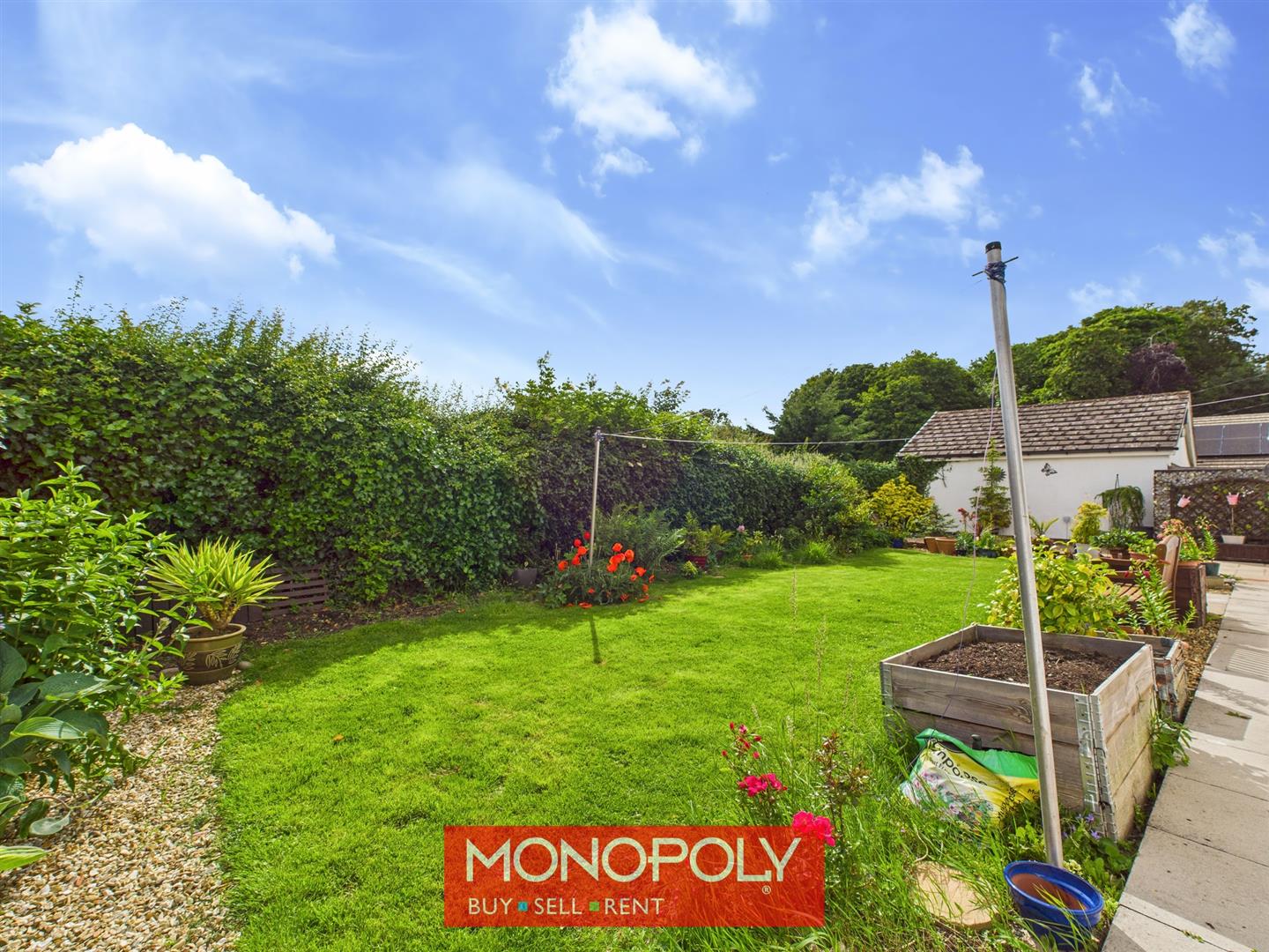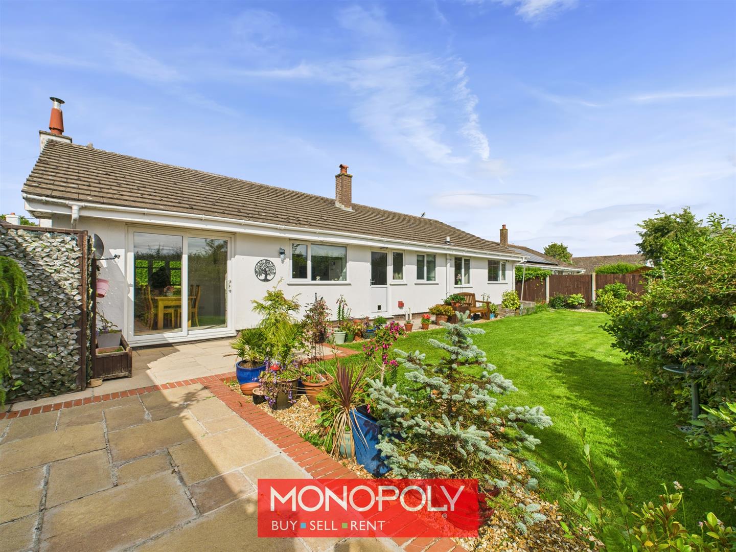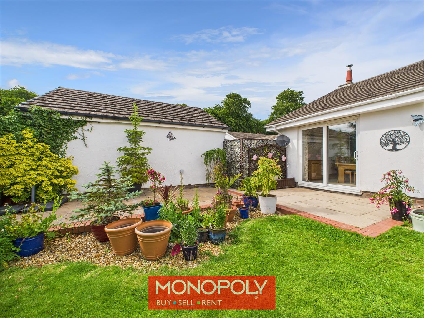 The garden is a peaceful and private outdoor space, featuring a well-maintained grass lawn, a paved patio area ideal for relaxing or entertaining, and lush surrounding foliage. A gravel border adds texture, while wooden panel fencing ensures privacy. A wrap-around path to one side provides easy access around the bungalow.