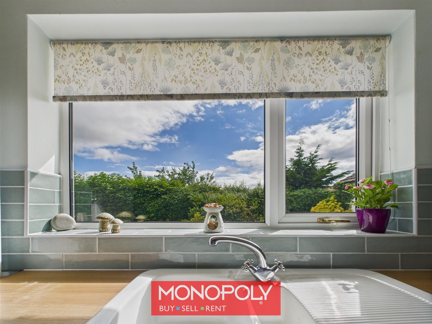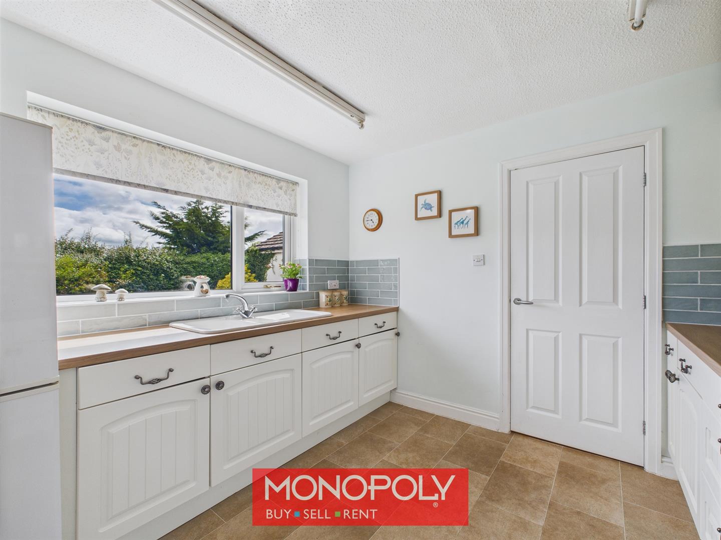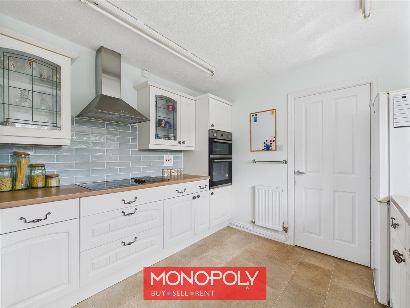 The kitchen features cream square raised cabinets and tiled splashbacks on both sides, blending style with functionality. Tiled flooring and two strip lights enhance the practicality of the space. A traditional-style sink sits beneath a double-glazed window overlooking the garden, while integrated appliances include an eye-level oven and grill, a four-burner hob, and an extractor hood. There is ample space for a freestanding fridge freezer, along with a radiator and towel rail for added convenience.