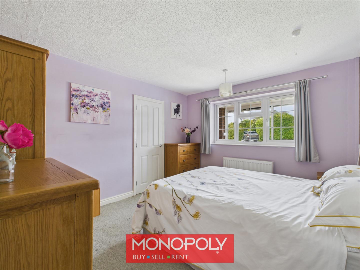 This comfortable double bedroom is carpeted and enjoys a pleasant view of the garden through a large window. It features a radiator for warmth and built-in surround storage, offering both practicality and space efficiency.