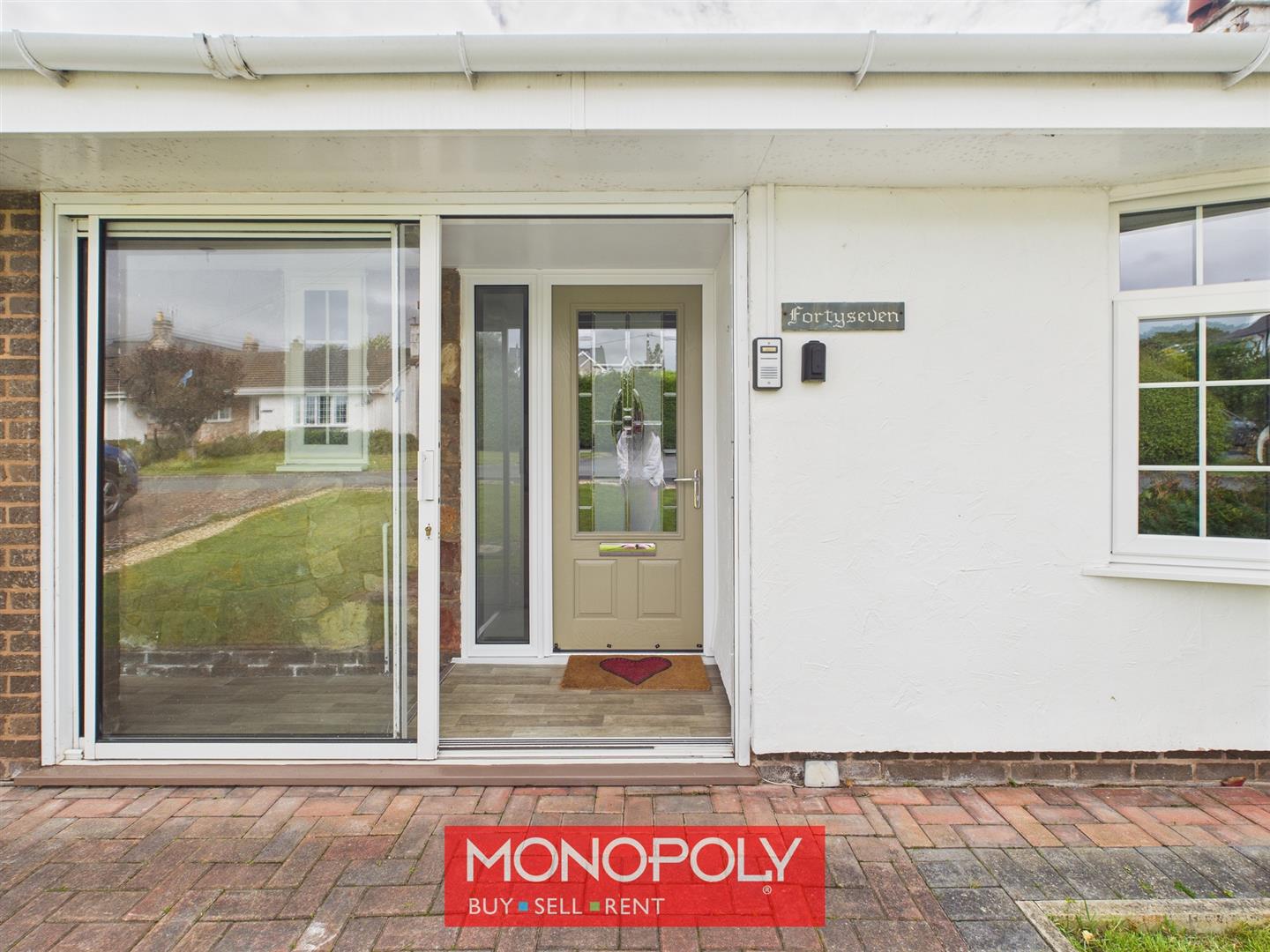 The enclosed entrance spans the length of the property and features glass sliding doors that flood the space with natural light. Inside, a ceiling light and wood-effect vinyl flooring create a welcoming atmosphere, complemented by a striking stone exterior wall that adds character. A uPVC front door with a decorative panel provides a stylish entrance to the home.