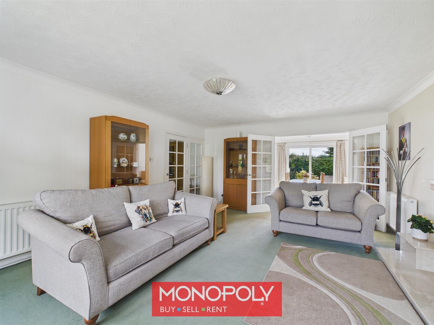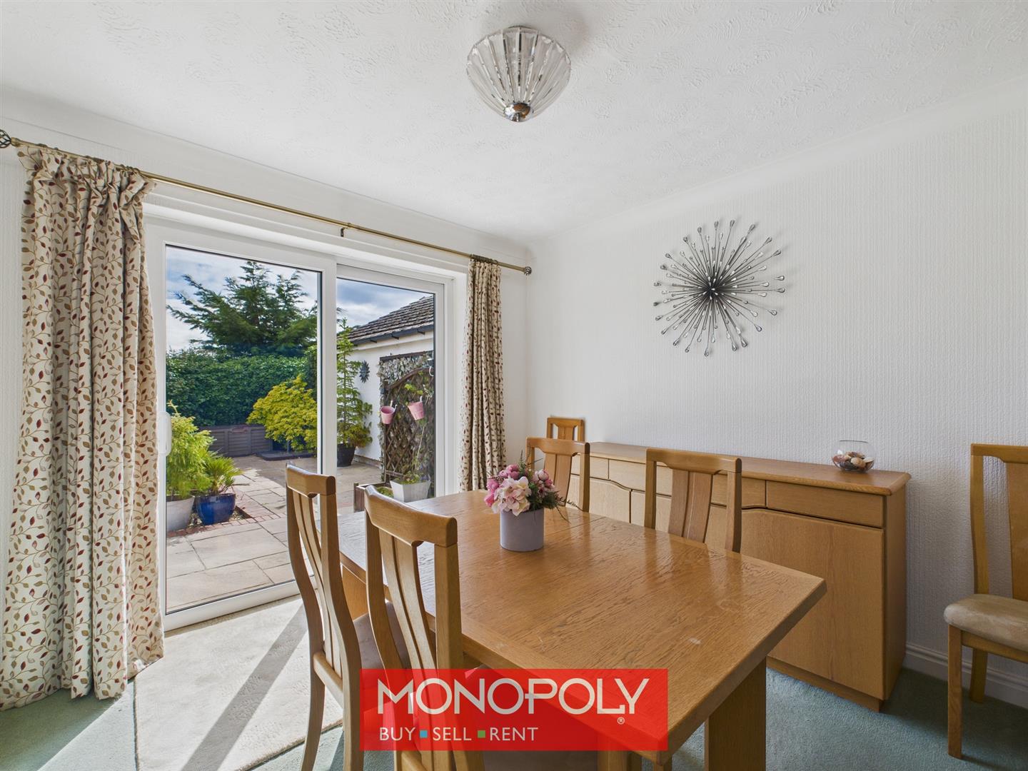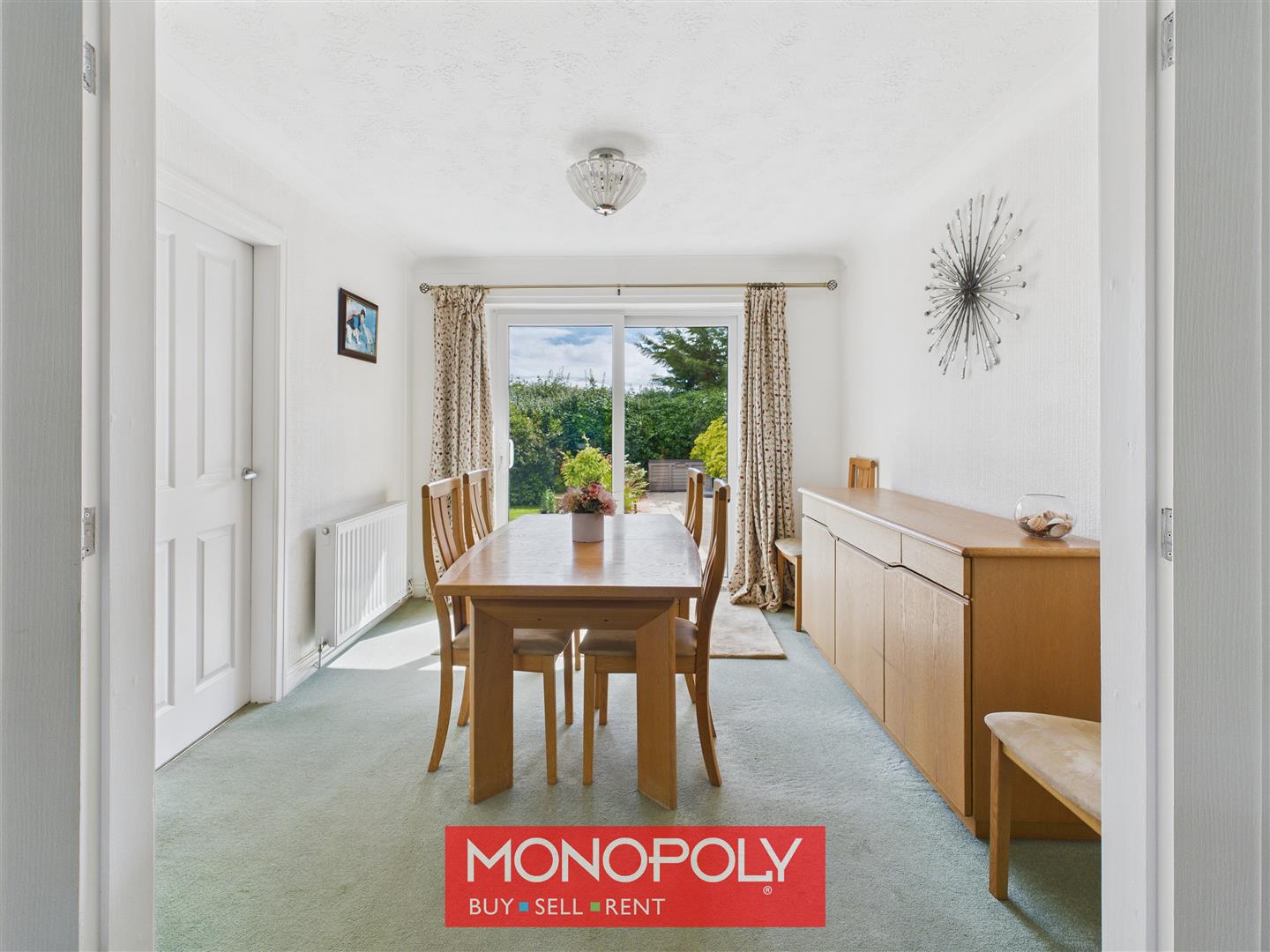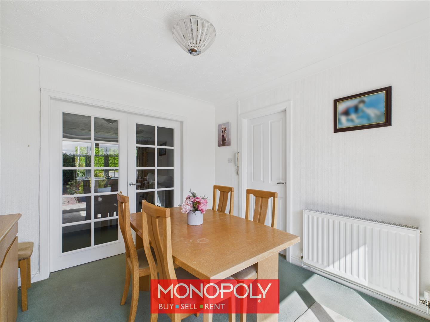 This dining room is carpeted and features a coved ceiling and a radiator for comfort. Twin glass panelled doors open into the lounge, while a painted wooden door leads to the kitchen. Glass sliding doors at the rear provide access to the garden and fill the room with natural light, creating a bright and welcoming space.