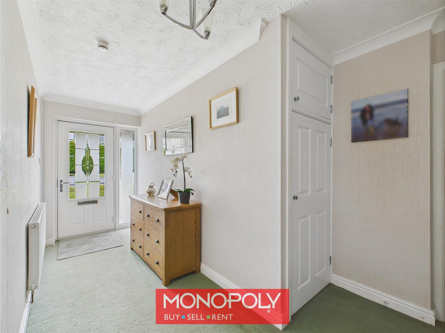 The entryway is carpeted and features a coved ceiling for a touch of elegance, along with a practical cloak cupboard providing useful storage space.