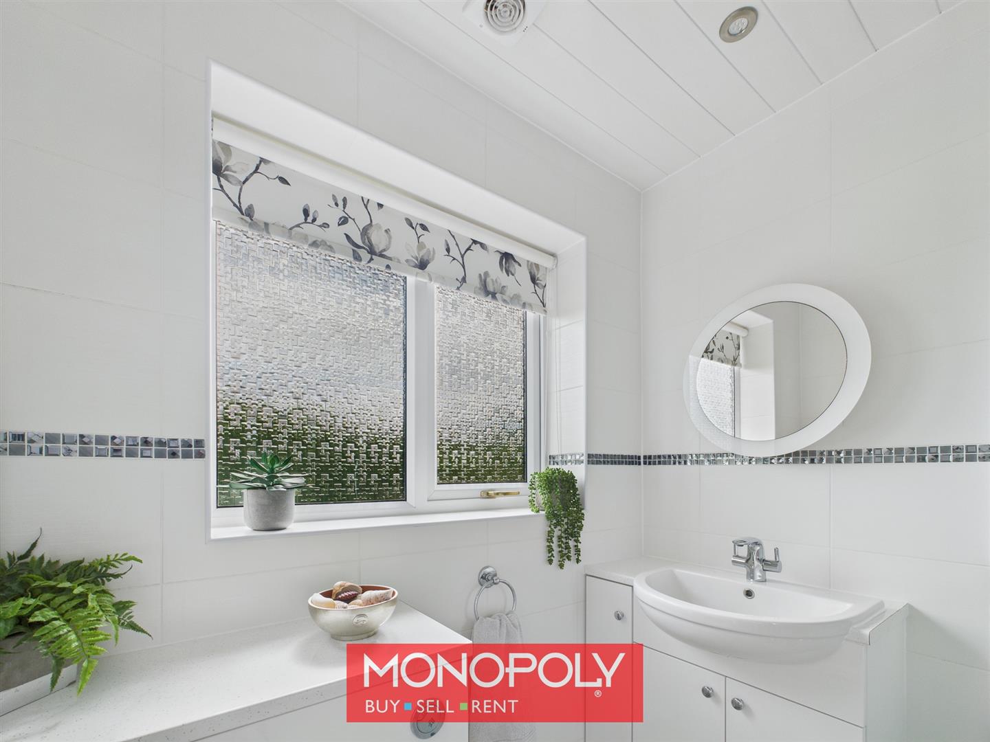 The shower room is stylishly finished with tiled flooring and fully tiled walls, complemented by a panelled ceiling with modern downlights. It includes a walk-in shower, a sleek sink unit, and a matching toilet unit. A towel point and extractor fan add practicality, while a textured window to the garden provides both light and privacy.
