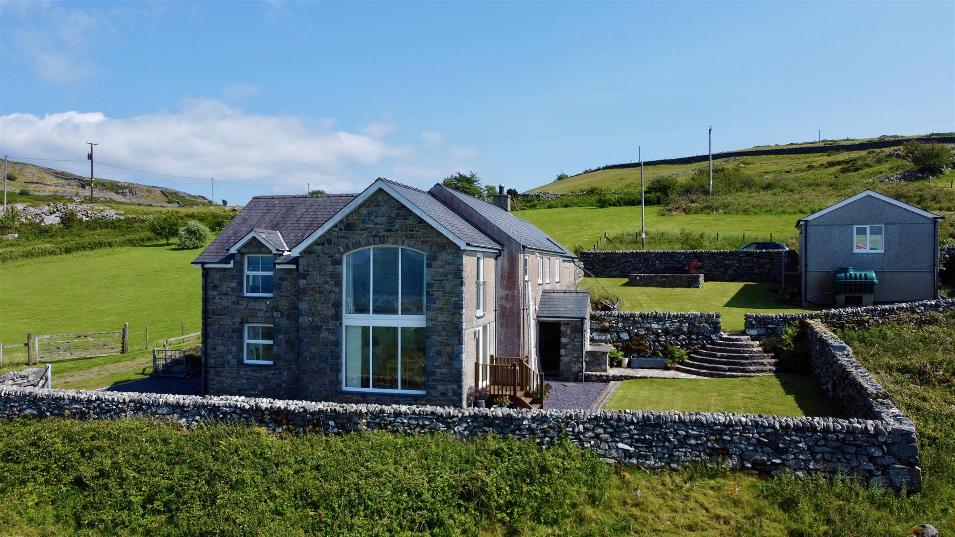 The property benefits from blue slate chipped gated parking and beautiful landscaped lawns with a very sunny aspect facing the coast. Totally enclosed by stone walling there are patio seating areas and stone wall features.