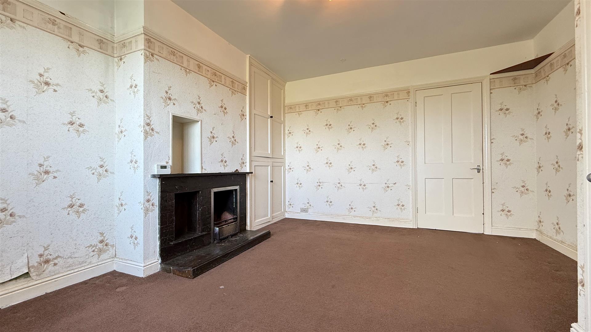 With fireplace and original alcove cupboards, original picture rail and window to the front. A door leads to the rear hall.