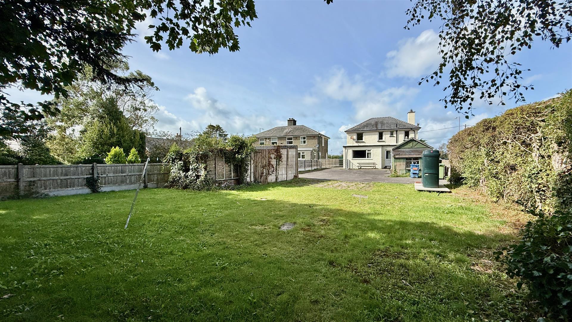 The property is nicely set back behind a lawn and hedges. There are dual gated driveways. One to the side and one to the rear leading on to a large tarmac area with plentiful parking for cars, vans etc. This leads on to a large lawned area with patio boarded with trees at the bottom of the garden. There are castle views and the garden is totally enclosed.