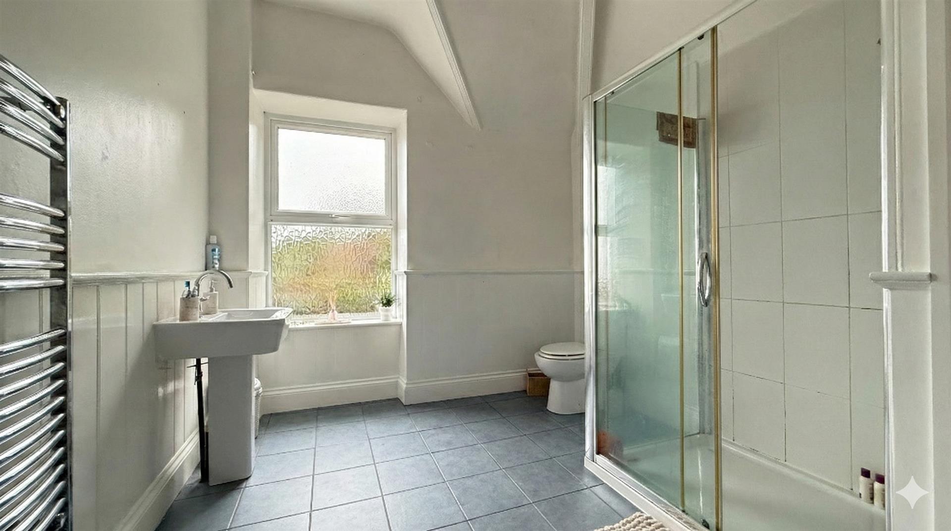 With white suite comprising of low level WC, hand basin and double walk in shower cubicle. There are half panelled walls, a heated towel rail and a linen cupboard. Window to the side.