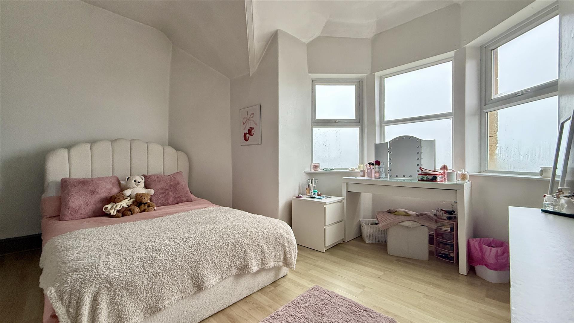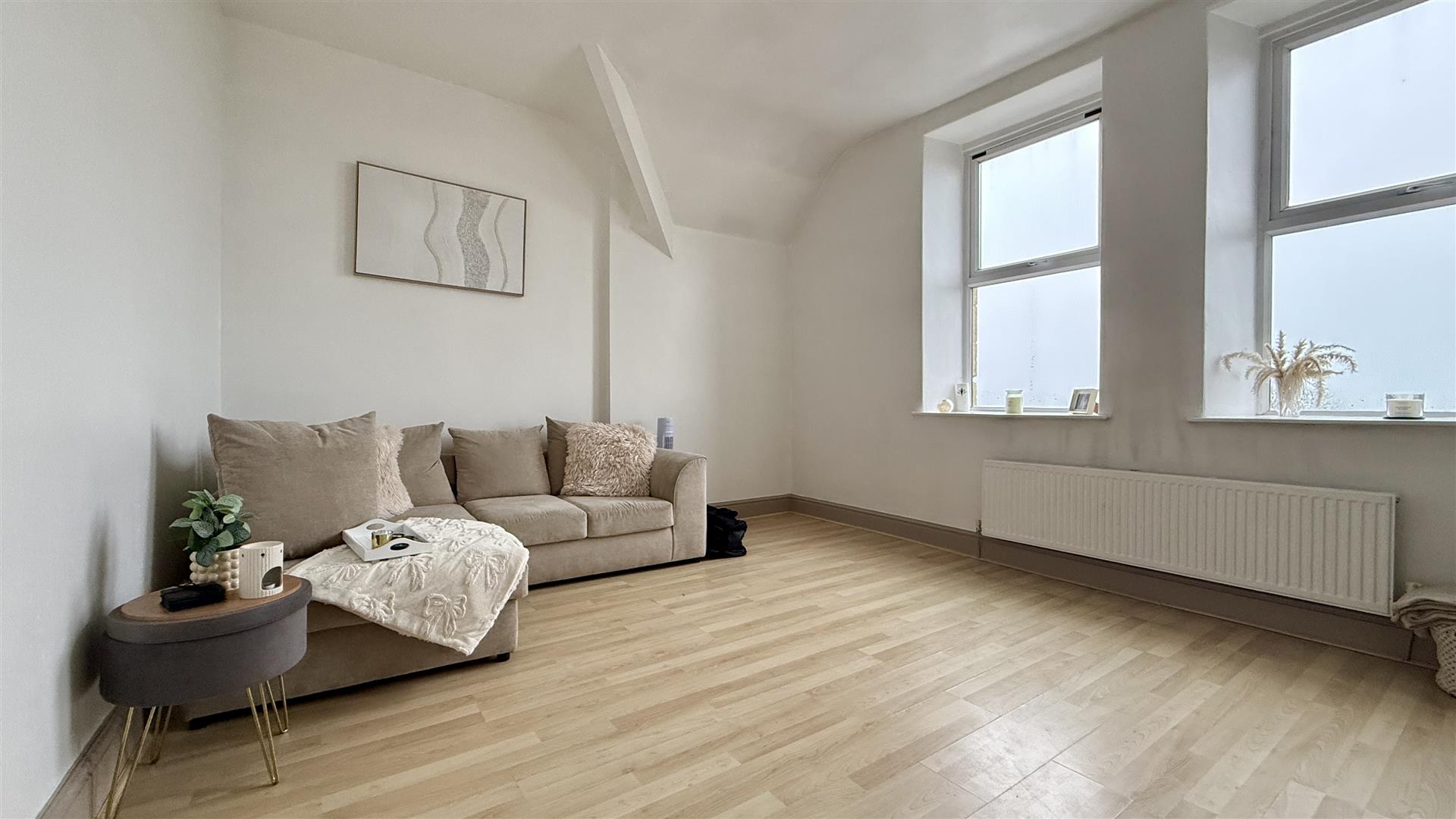 A lovely light and airy room with two large windows to the front providing lovely sea, town and coastal views. There is wood effect laminate flooring.