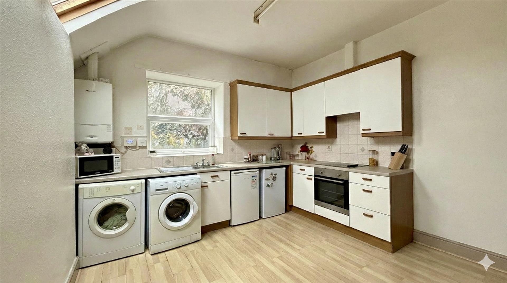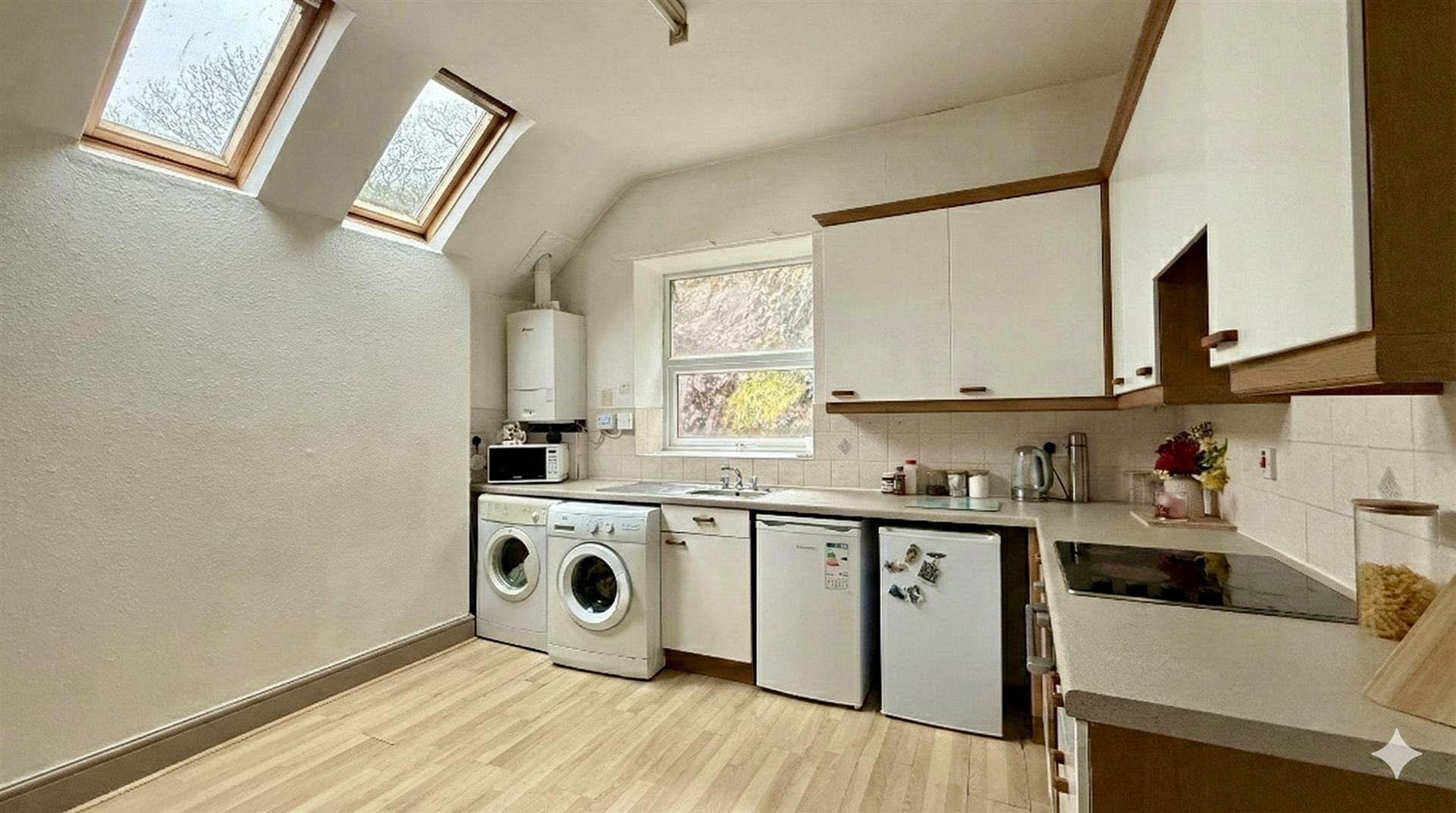 Extremely spacious with room for large table and chairs as well as a generous range of wall and base units. There is a new integral oven with hob and extractor over, space and plumbing for washing machine, space for tumble drier, space for under counter fridge and under counter freezer. There is a window to the rear and two roof light windows.