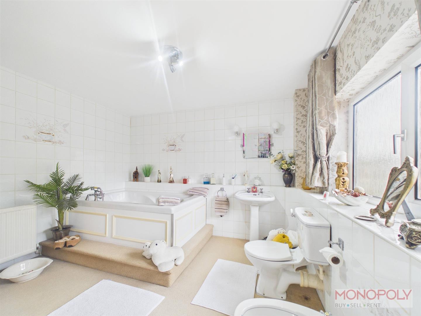 This spacious family bathroom is fitted with a white five-piece suite comprising a large raised corner bath with twin moulded seats and chrome mixer tap, a separate fully enclosed shower cubicle with fitted shower system, pedestal wash hand basin, low-level WC and bidet. The walls are predominantly tiled with decorative detailing, complemented by partial wall panelling. A frosted window to the rear elevation provides natural light while maintaining privacy. Additional features include a chrome heated towel rail, wall-mounted mirrored cabinet, ceiling light point and radiator. The room offers generous proportions and practical family functionality.