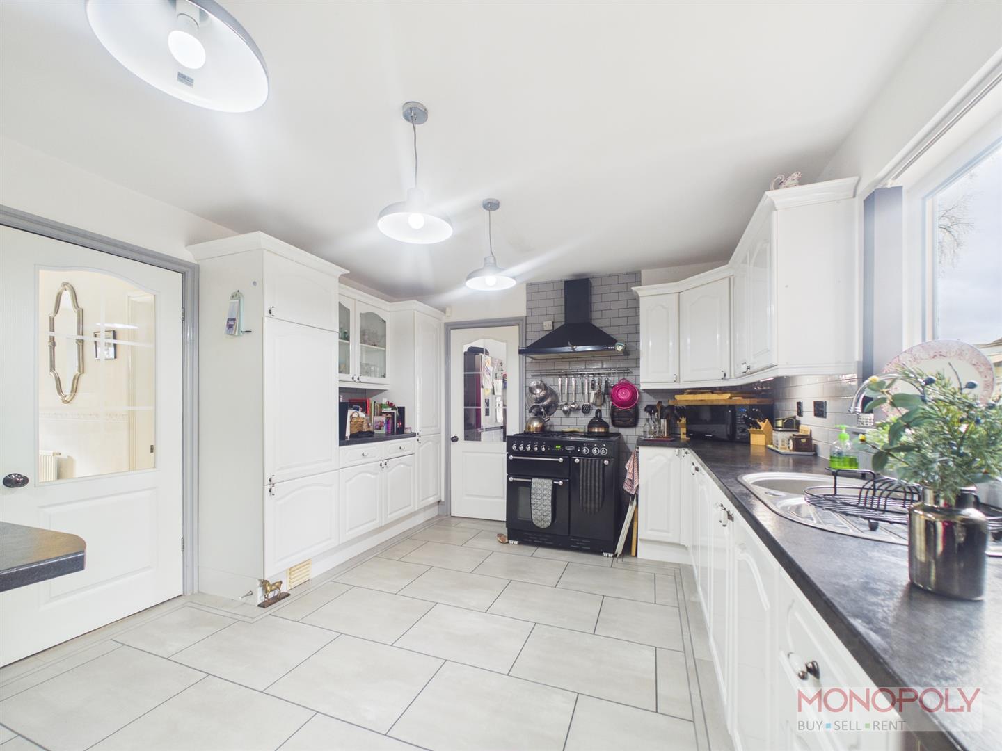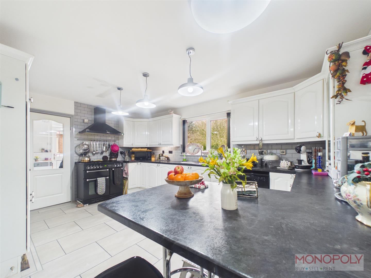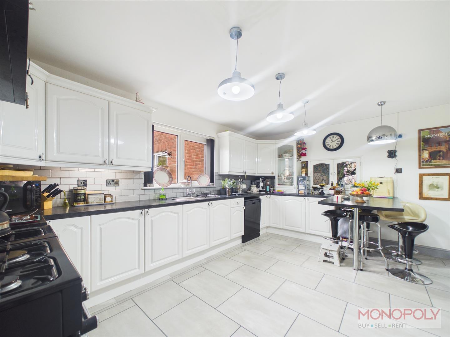 UPVC double glazed window to the rear elevation. Spacious kitchen/breakfast room housing a range of wall, drawer and base units with complementary work surface over. Space for multiple appliances to include dishwasher, range master cooker, and in integrated fridge. Circular stainless steel sink unit with mixer tap over, tiled floor, panelled radiator, integrated breakfast bar area, four pendant ceiling light points, part tiled walls, under counter lighting, serving hatch into reception room and door leading into utility room.