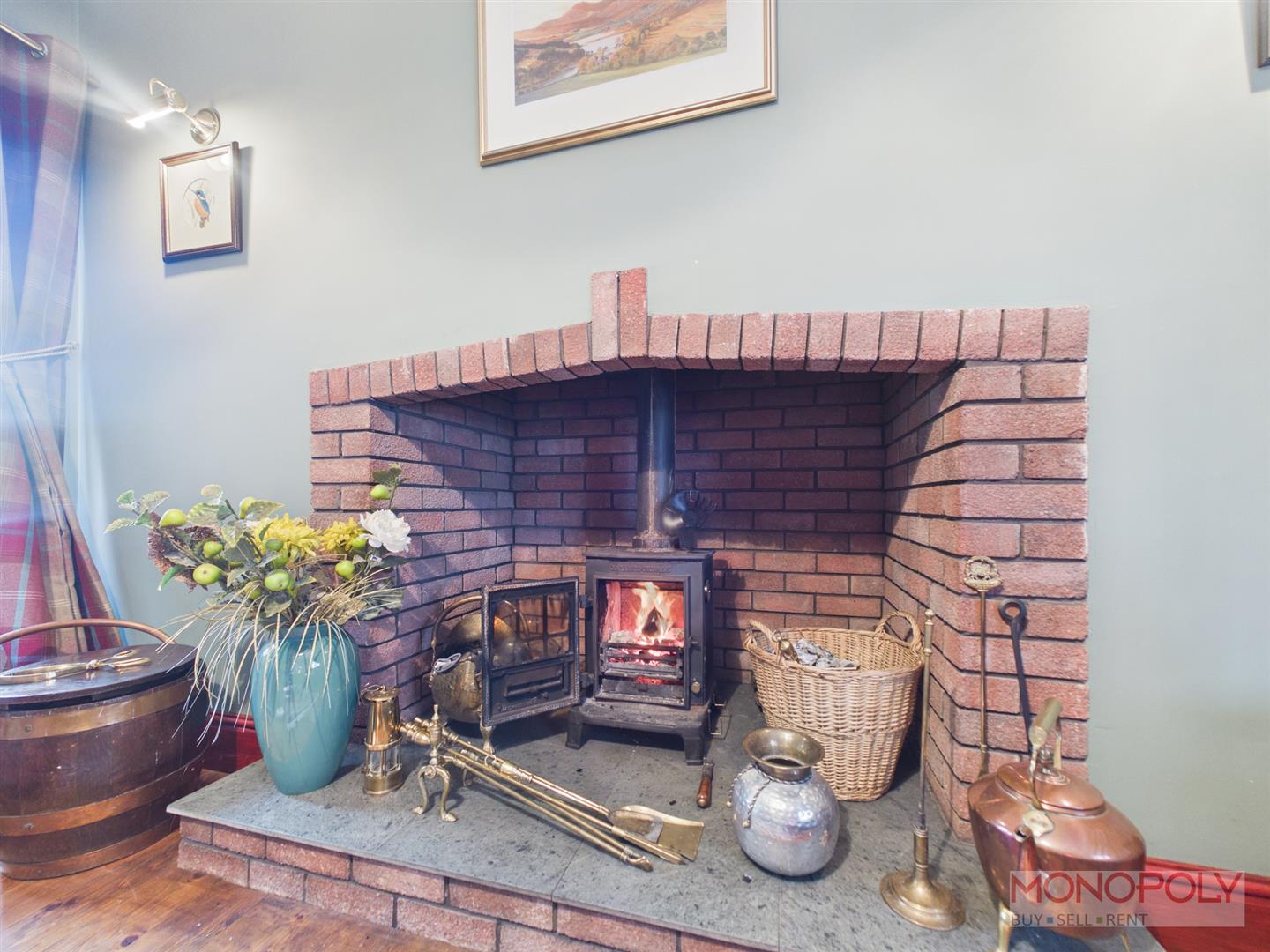 UPVC arch shaped window to the front elevation and double glazed stained glass window to the rear. Multi-fuel burner sat within a brick alcove and tiled hearth. Pine wooden flooring, panelled radiator, ceiling light point, two wall lights and glazed wooden door into music room.
