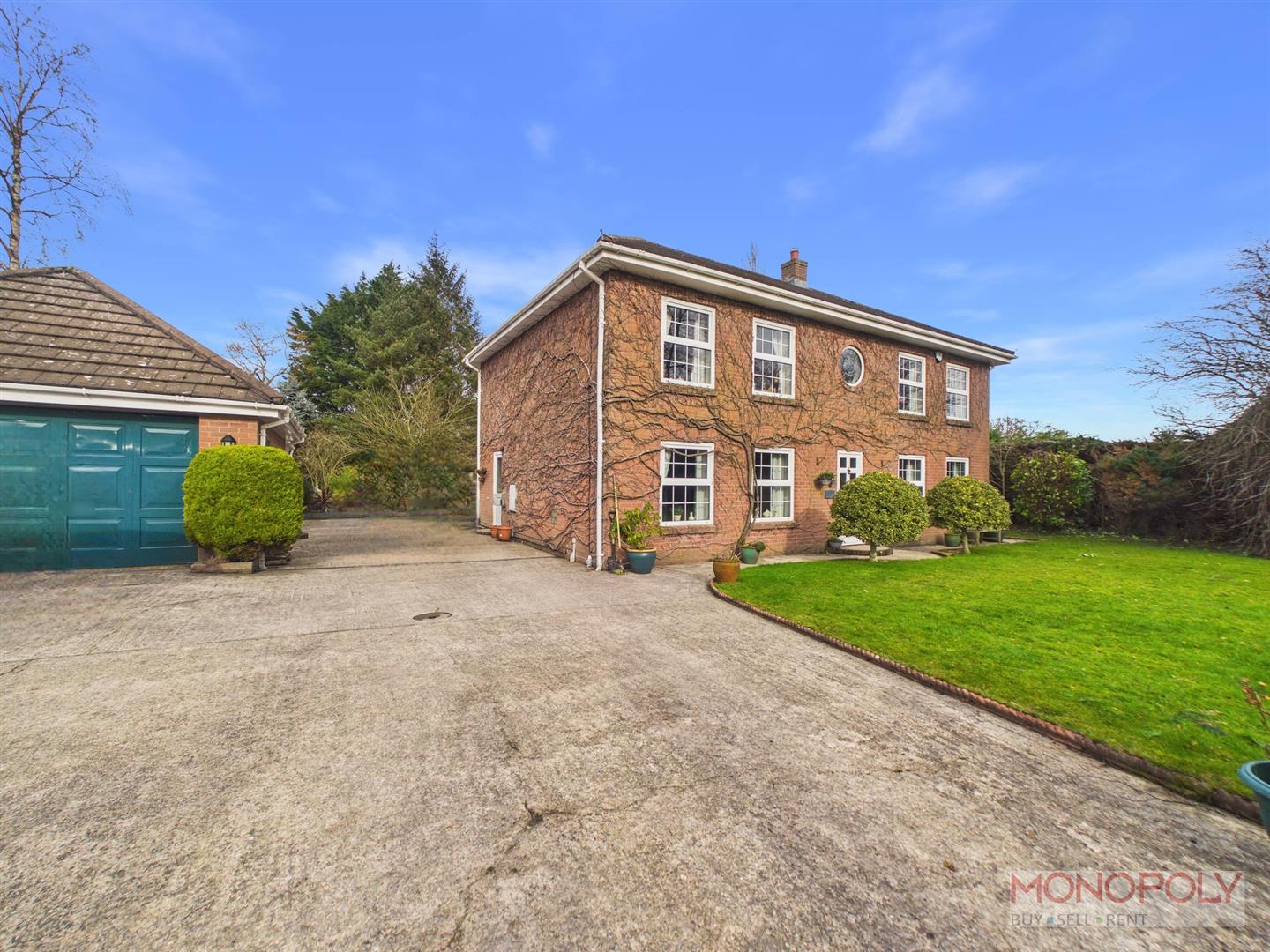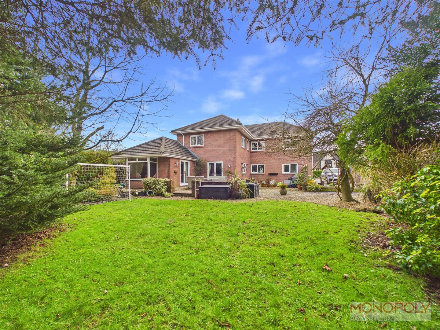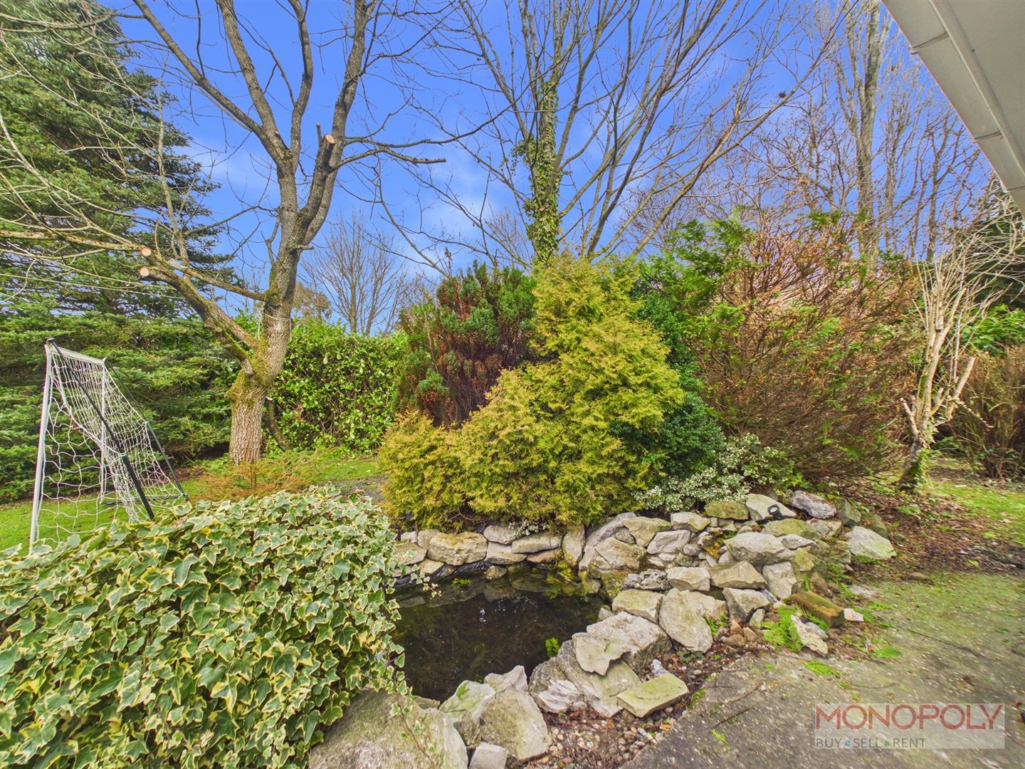 The property is approached via one of two double wrought iron electric gates, opening onto an extensive concrete driveway providing ample parking and access to a detached double garage and workshop. The attractive Georgian-style double frontage is complemented by a well-maintained front lawn with established trees, including pear willow, and mature planting that enhances the setting. Running alongside the property is a detached laundry room/workshop, with the driveway continuing seamlessly through to the main rear garden. The gardens have been thoughtfully landscaped over many years to create a series of defined yet interconnected outdoor spaces. To the rear, a generous lawn forms the centrepiece, bordered by mature trees and established shrubs. There are raised sleeper beds with a vegetable growing area, greenhouse, a timber-built summerhouse, hot tub area and an additional timber storage shed. Decorative stone seating areas and paved patios provide multiple spots for entertaining and relaxation. The grounds also feature three water elements, including a stone-surround waterfall with pond and two additional ponds, creating attractive focal points throughout the garden. An orchard area to the right-hand side includes cooking apple, Greengage plum and Victoria plum trees, with other trees in the garden being silver birch, chestnut and edible horse chestnut. Further practical additions include external power points, outside lighting, a water tap and a 1000-litre oil tank positioned discreetly behind the garage.