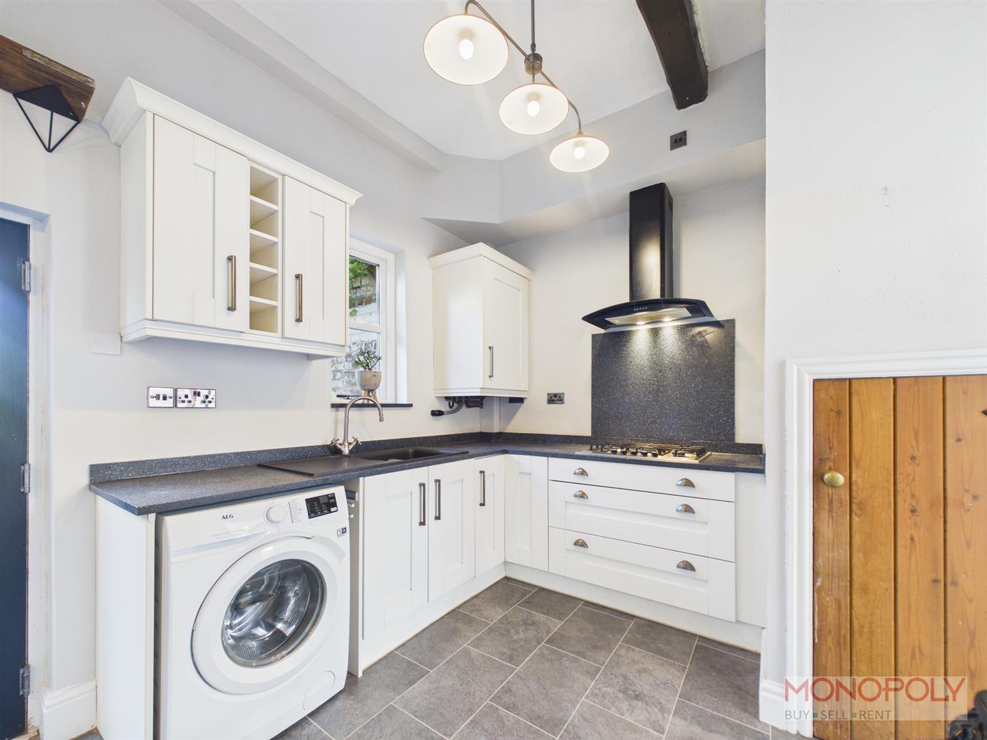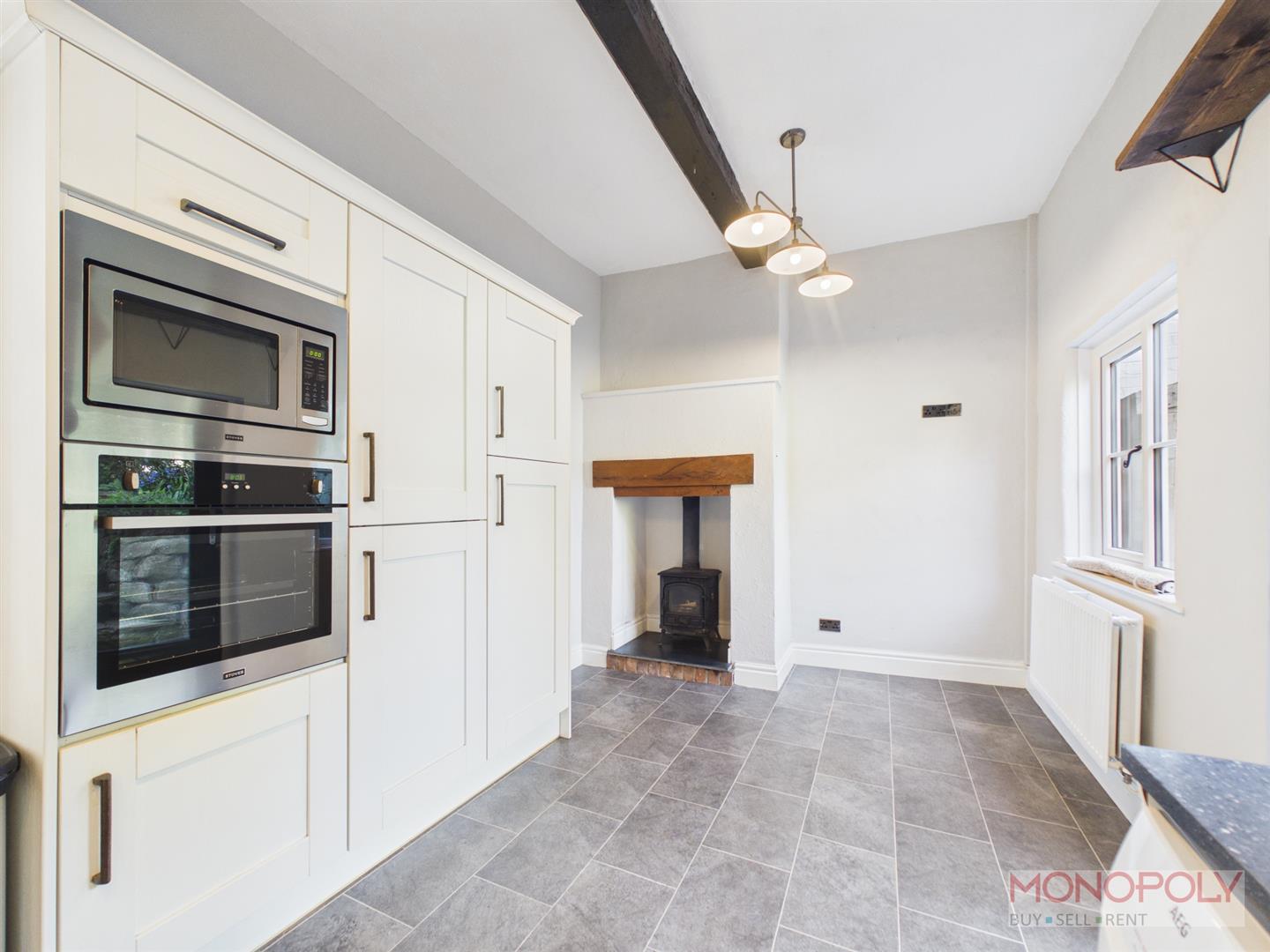 Open plan area with the kitchen housing a range of wall, drawer and base units with complimentary work surface over incorporating a composite sink unit and mixer tap. Integrated appliances to include five ring gas hob, extractor, fridge-freezer, eye-level oven and grill. Space for washing machine. Opening into the dining area with space for dining table, log burner set on a slate hearth with wooden mantel. The room is finished with tiled flooring, beamed ceiling, ceiling light points, radiator, access to under-stairs storage cupboard, two wooden double glazed windows to the rear elevation and glazed door to the garden.