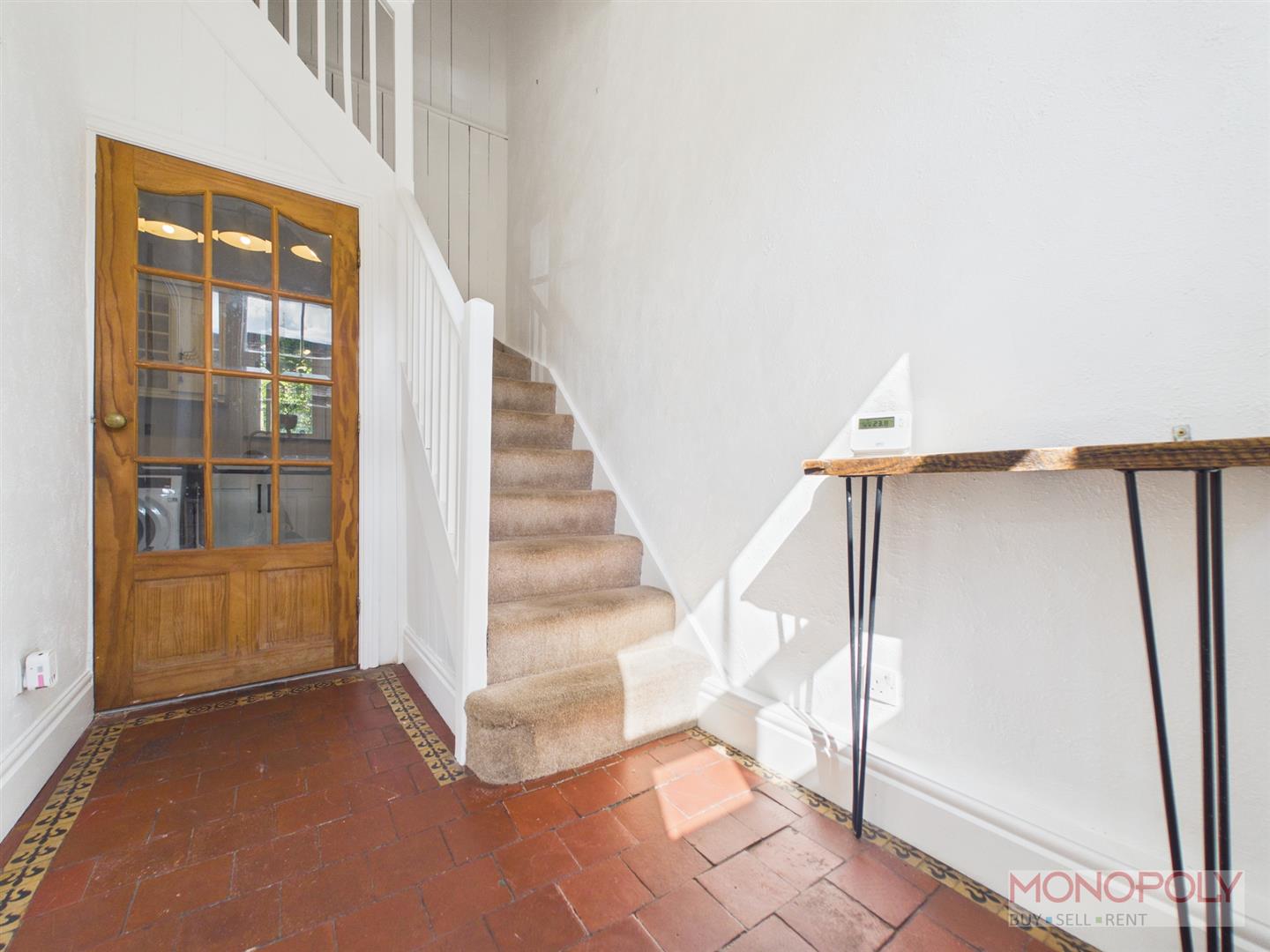 Hardwood door leads into entrance hallway with original quarry tiled flooring, beamed ceiling, radiator, ceiling light point, stairs to first floor, doors to kitchen/dining and living room.