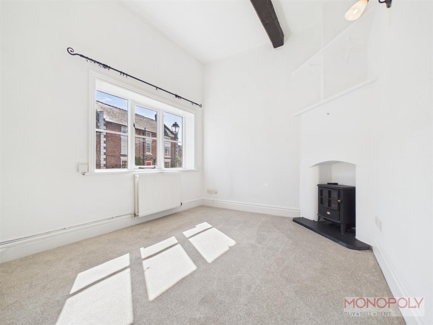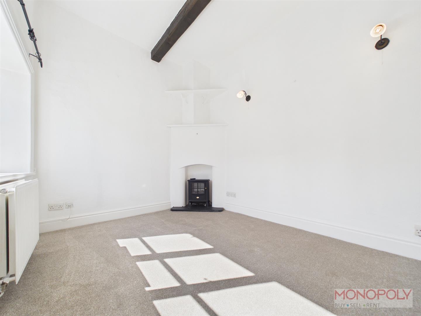 Wooden double glazed windows to the front, alcove with electric fireplace, carpet flooring, radiator, beamed ceiling, ceiling light point and wall lighting.