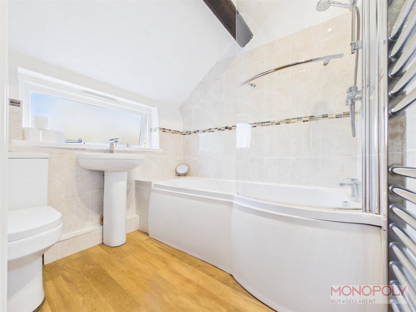 Three piece suite comprising low-level WC, pedestal wash hand basin and 'P shaped' panelled bath with shower over. Chrome heated towel rail, wooden laminate flooring, ceiling light point, beamed ceiling, tiled walls and double glazed frosted wooden window to the rear.