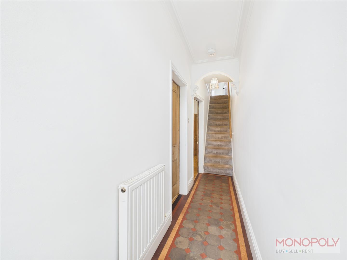Hardwood door leads into entrance hallway with original tiled floor and architrave. Radiator, ceiling light, stairs to first floor and door into living room.