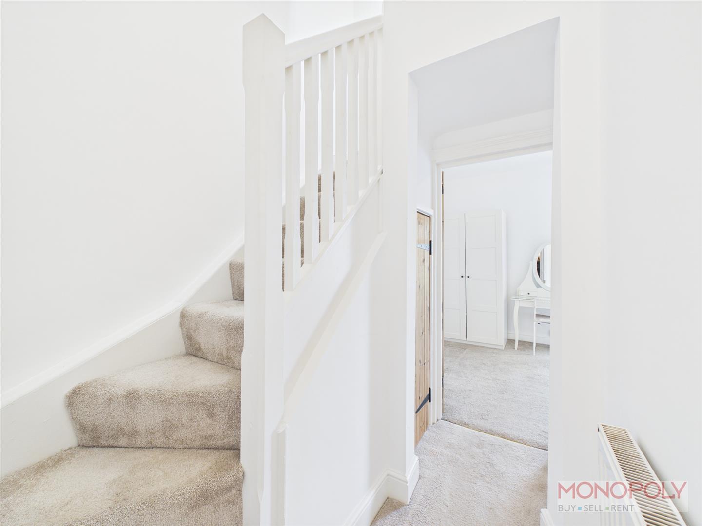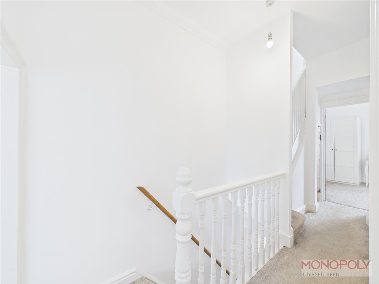 Spacious landing area with carpeted flooring, radiator, ceiling light point, doors to two bedrooms, bathroom and under-stairs storage.