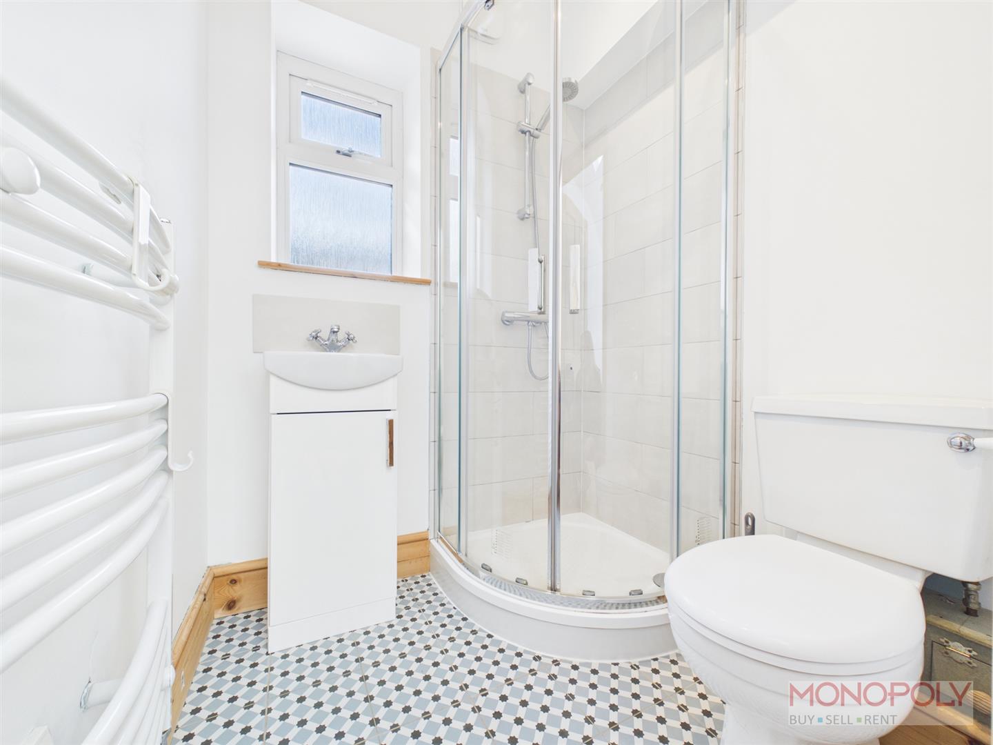 Three piece modern suite comprising low-level WC, wash hand basin set on a storage unit and mains corner shower cubical. Heated towel rail, tiled flooring, extractor, recessed LED lighting and frosted uPVC double glazed window to the rear.