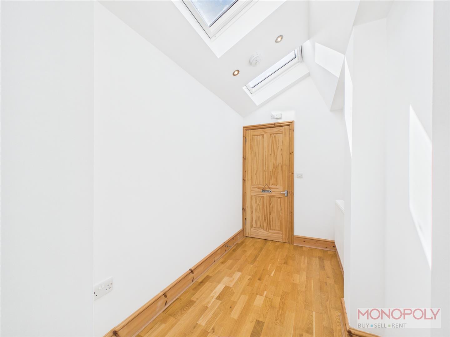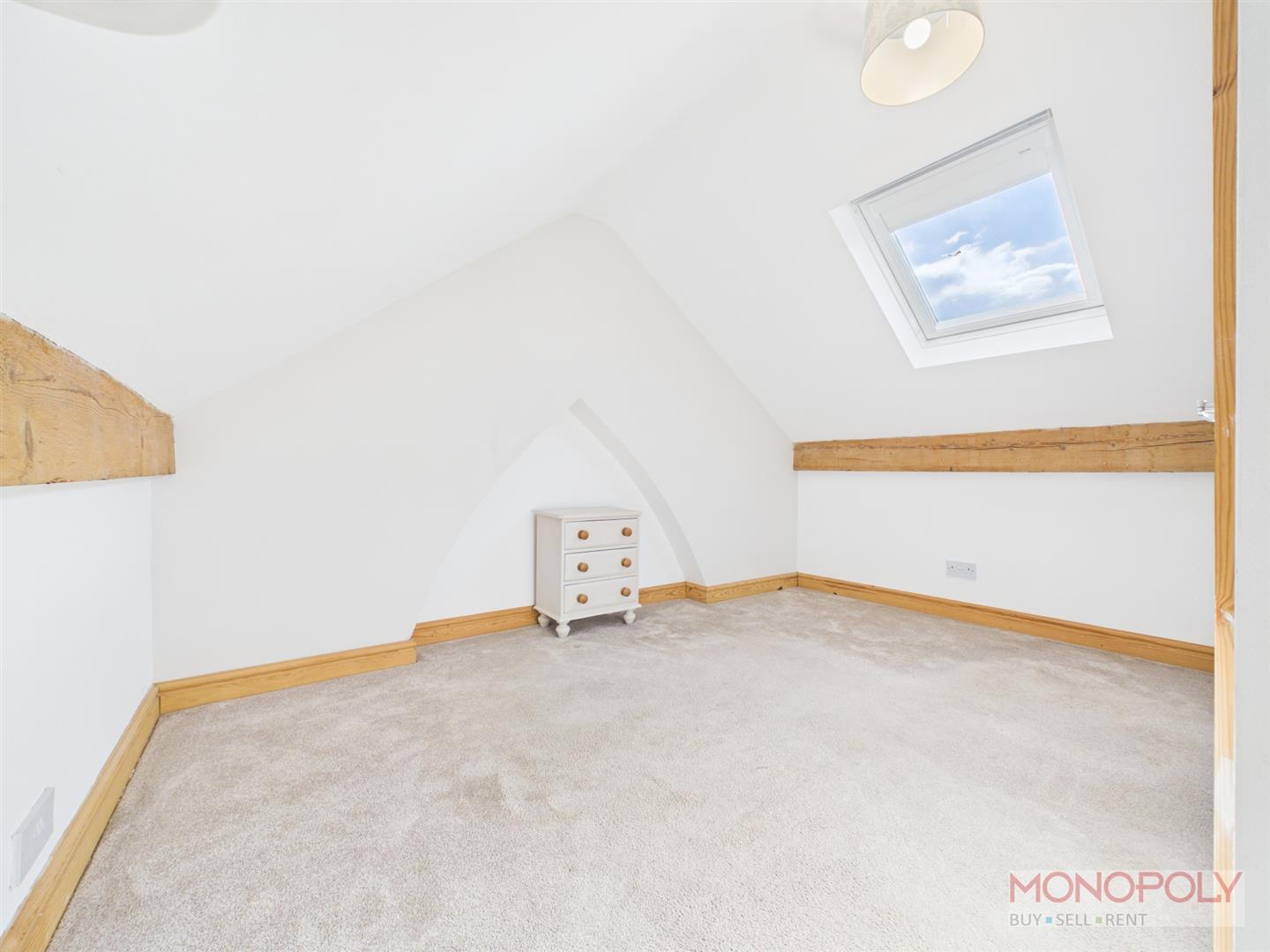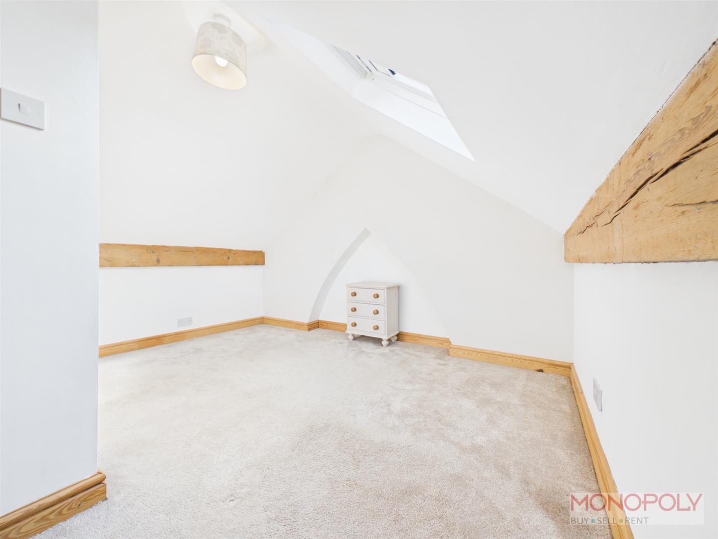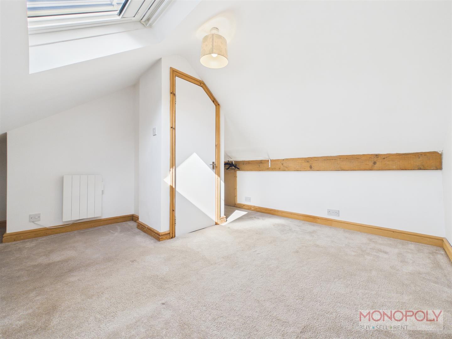 Stairs from landing area lead to the third bedroom/loft conversion. A double bedroom with Velux sky light, carpeted flooring, ample eave storage, wall-mounted electric radiator, ceiling light point, exposed wooden beams and arch shaped alcove.