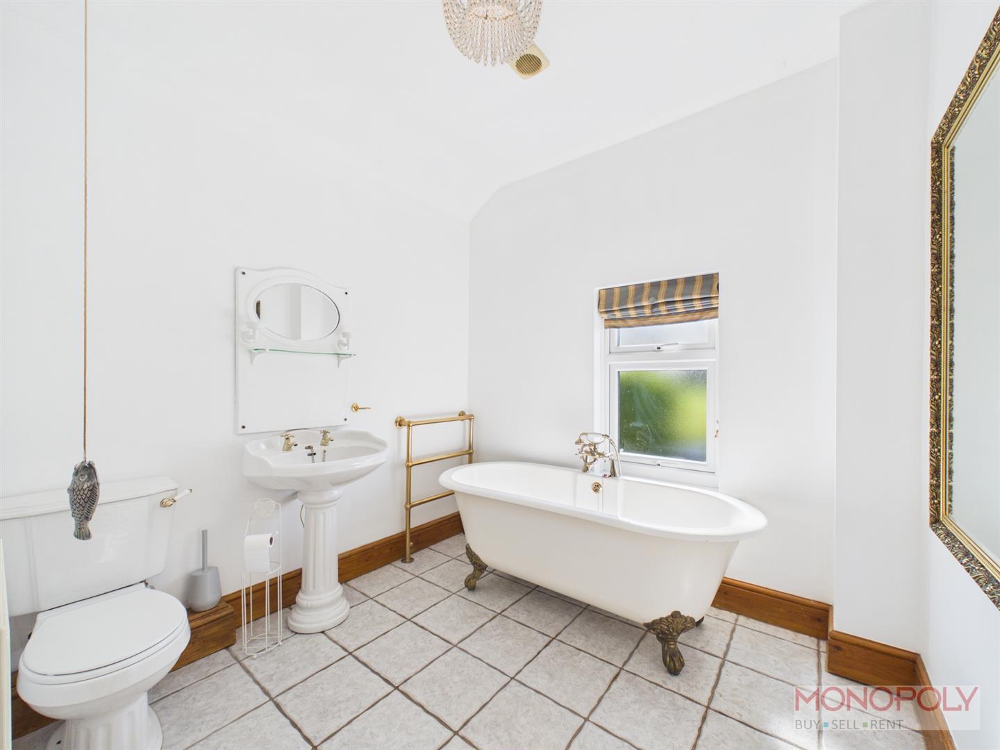 A beautifully appointed three-piece bathroom suite comprising a low-level WC, pedestal wash hand basin and a feature cast iron roll-top bath with clawed feet, traditional taps and handheld shower attachment. The room is complemented by tiled flooring, a period-style wall-mounted cast iron mirror and a towel rail. Additional features include a radiator, extractor fan, ceiling light point and a uPVC double glazed frosted window to the rear elevation, allowing for natural light while maintaining privacy.