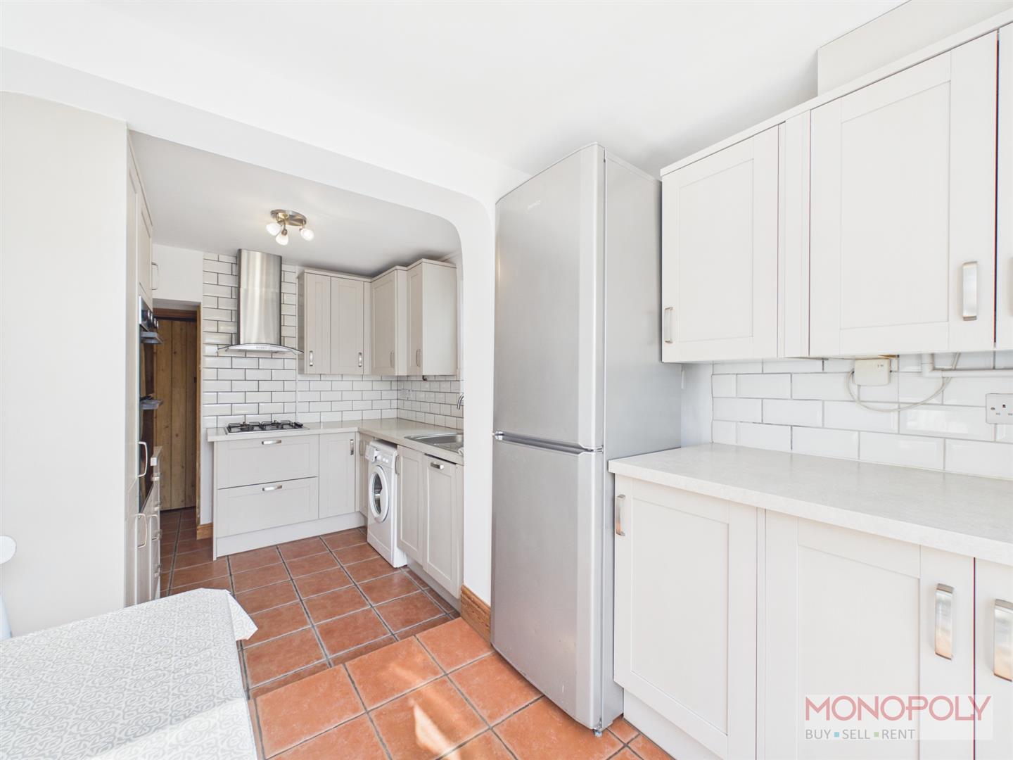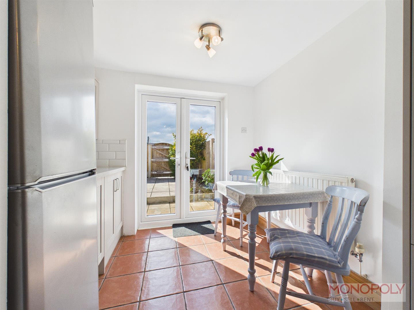 An extension to the original property with two Velux sky lights, recessed LED lighting, radiator, wooden laminate flooring, window into kitchen area and door into ground floor shower room.