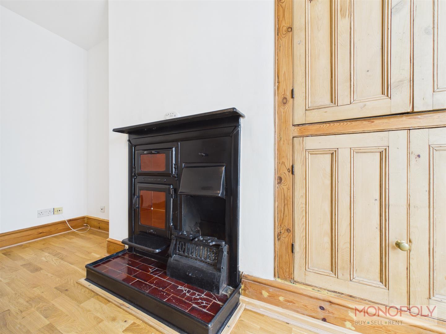 Featuring a traditional range style stove (ovens not in working order) and open fireplace. Two built in storage cupboards, wooden laminate flooring, radiator, ceiling light point, door to kitchen/breakfast area and opening into the sunroom/office area.