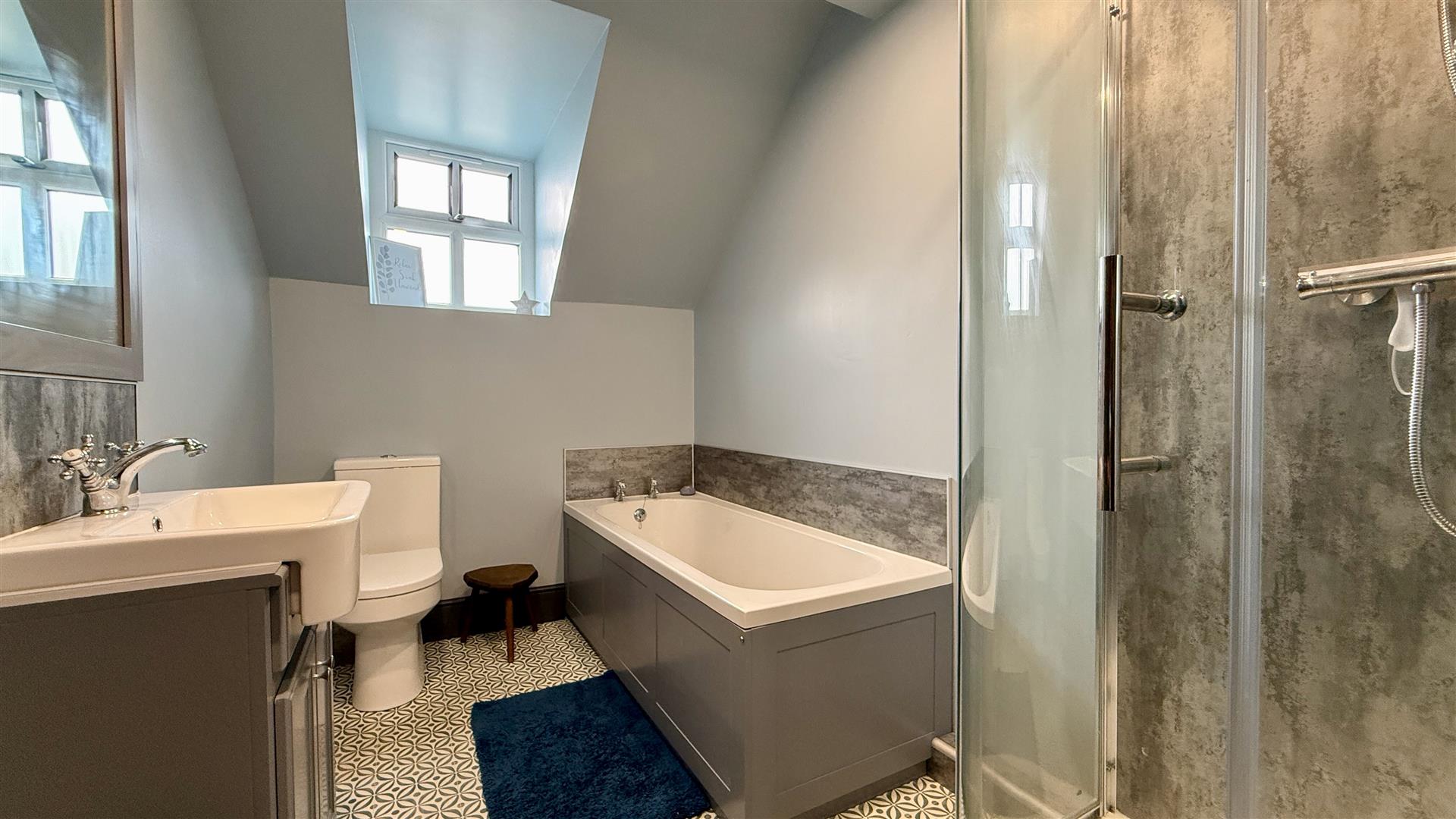 With white suite comprising of panelled bath, shower cubicle, ceramic sink in vanity unit, low level WC. Heated towel rail, mosaic vinyl flooring and window to the front.