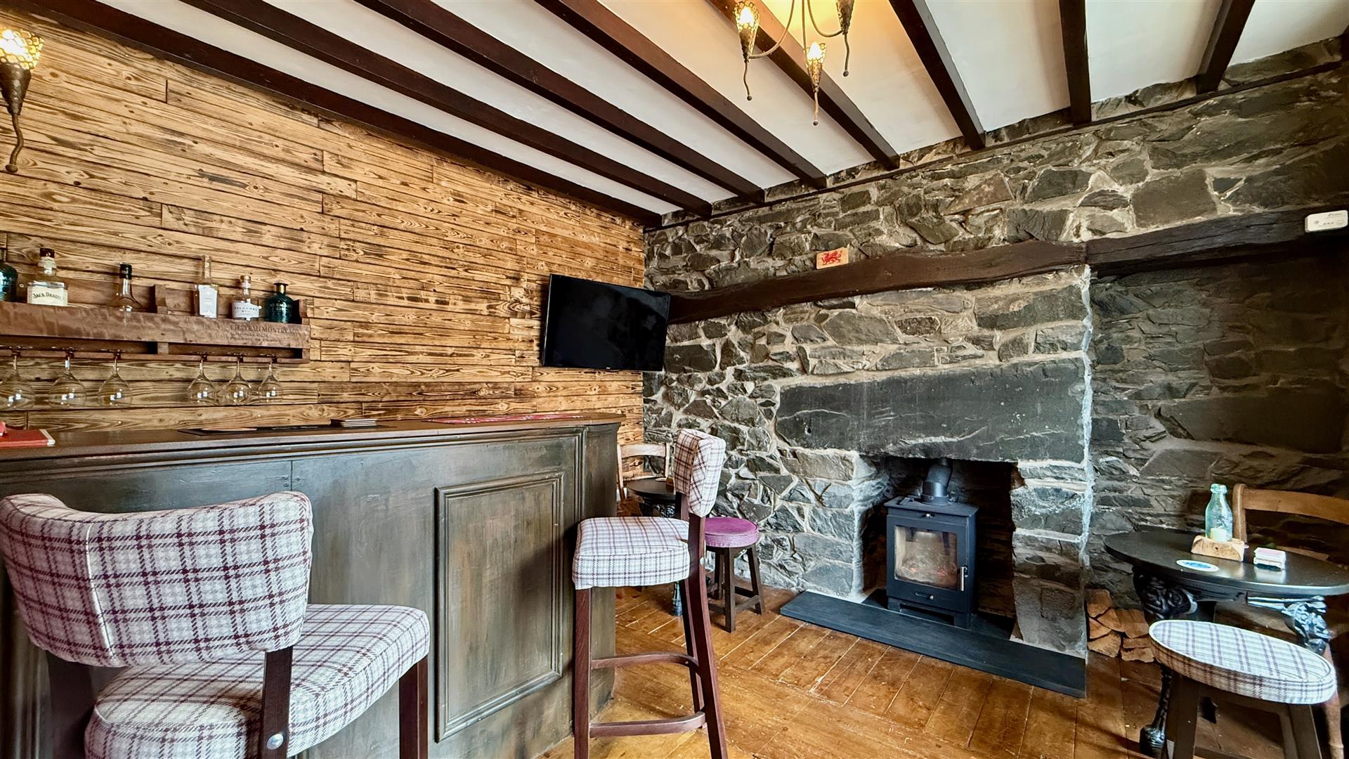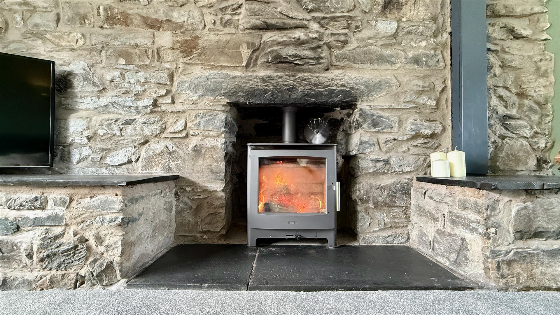 There is a wealth of exposed stone walling and a cosy log burning stove on slate hearth.