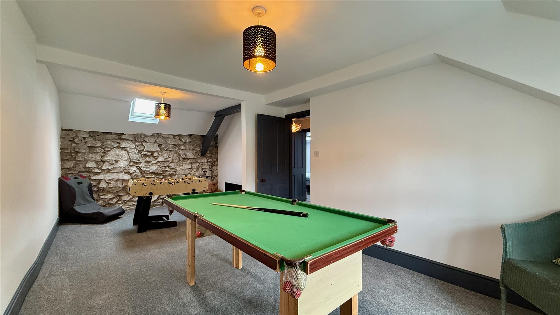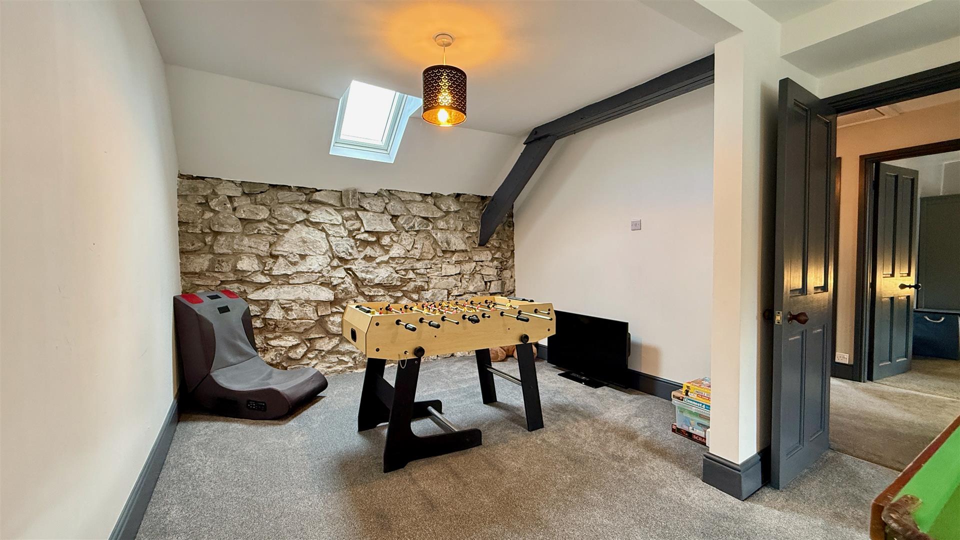 Running the length of the house, with window to front and Velux to the rear plus an exposed stone walling feature. A fabulous multifunctional room currently used as a games room with football table, pool table, comfy seating and a TV.