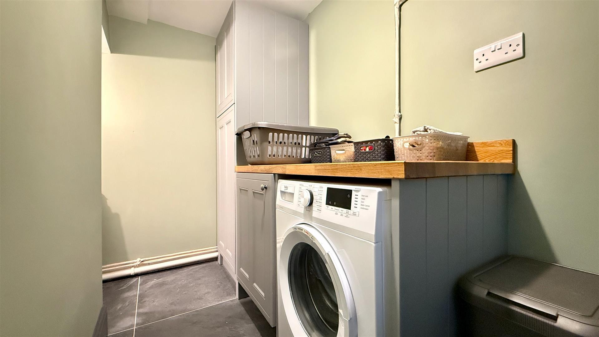 With porcelain tiles, integrated undercounter freezer, tall larder cupboard, and base unit with solid wooden work top, plus space and plumbing for a washing machine. A door leads to a further room which could create a WC and is currently used as a store room.