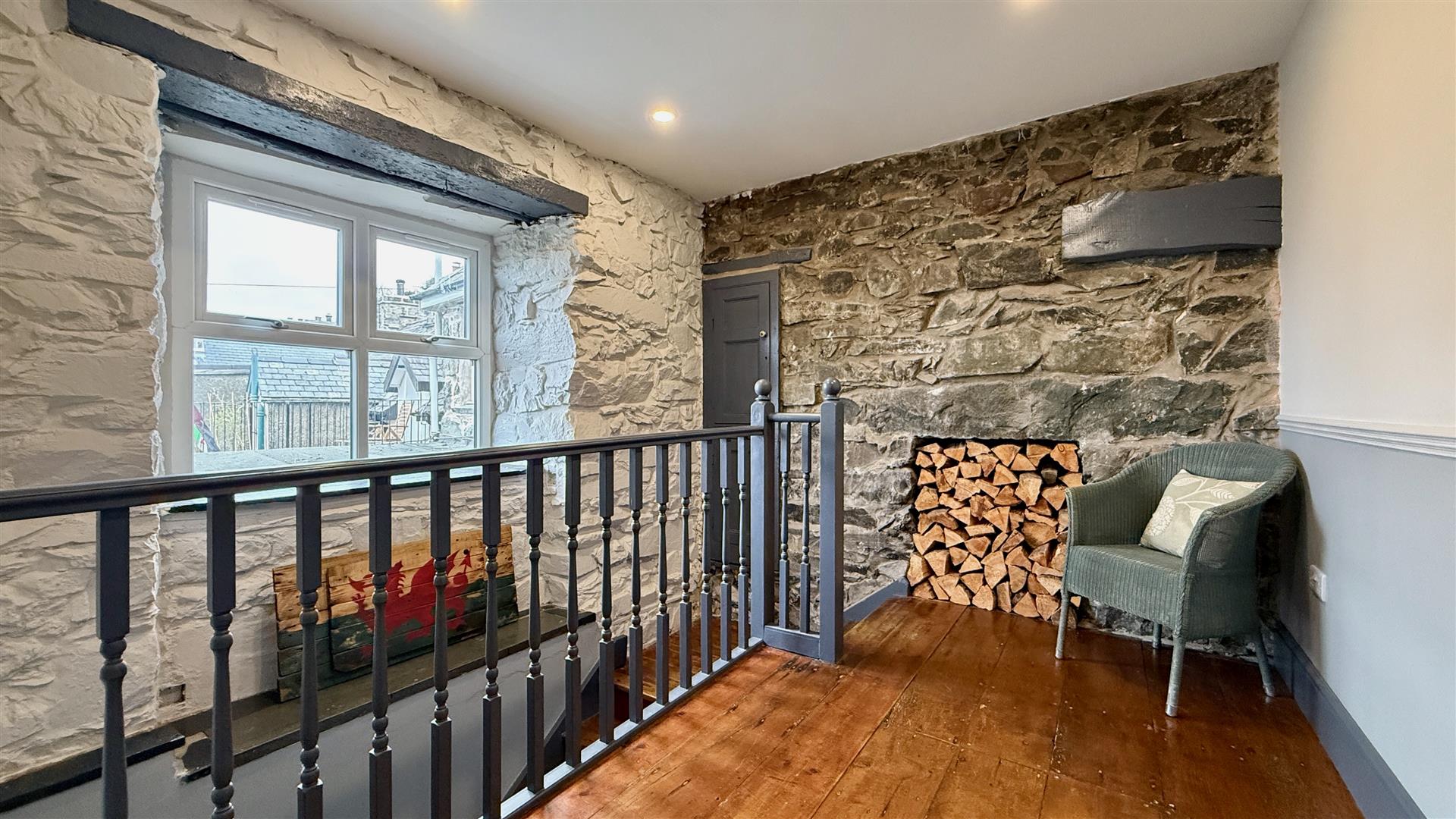With exposed wooden floorboards, exposed stone walling, alcove storage for log and built in cupboard. Stairs lead down to the kitchen and dining room and a window provides lovely views over Harlech roof tops and gardens to the coast.