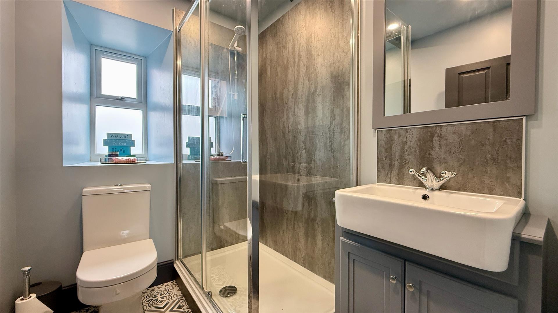 With grey mosaic tile effect vinyl flooring, low level WC, hand basin and shower. Window to the front (the en-suite is in the process of installation).