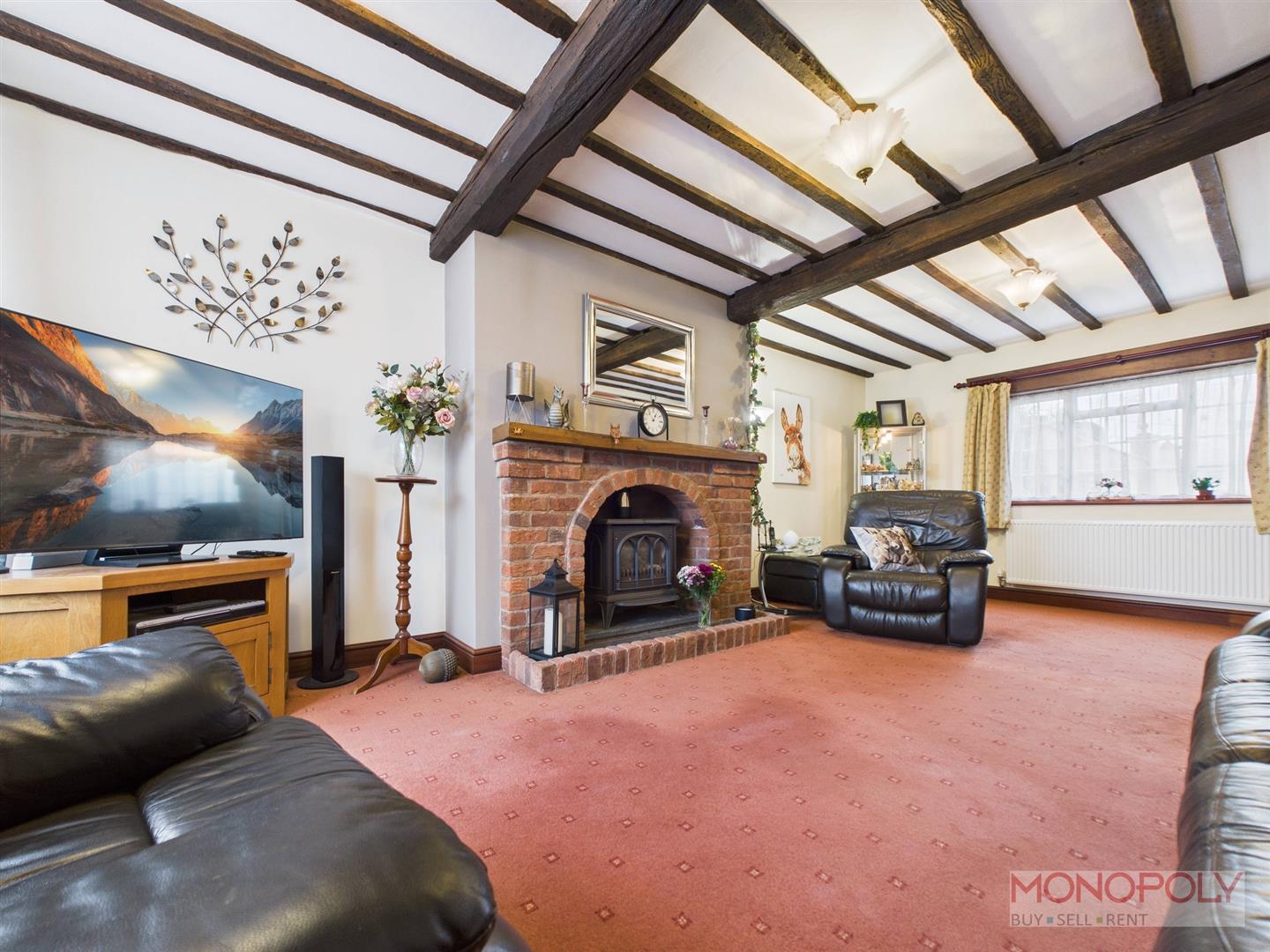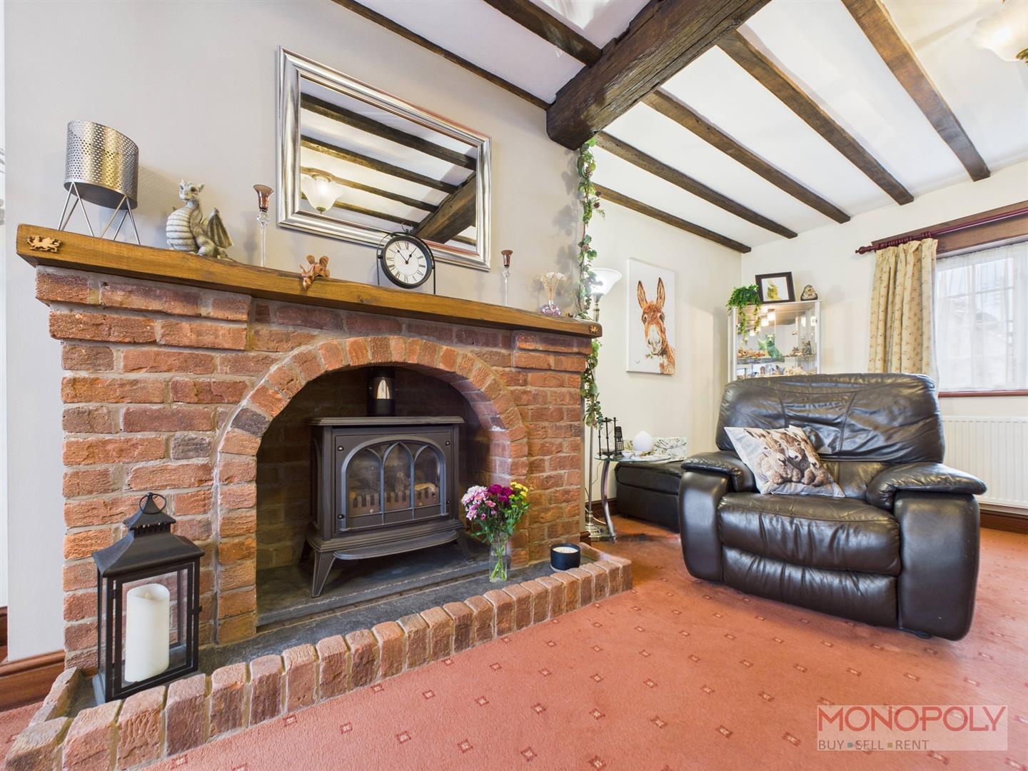 Featuring dual-aspect windows with a bay window to the front elevation with storage cupboard under, uPVC double glazed window to the rear, exposed ceiling beams, brick fireplace with gas log effect stove set on a slate hearth with timber mantel and carpet flooring