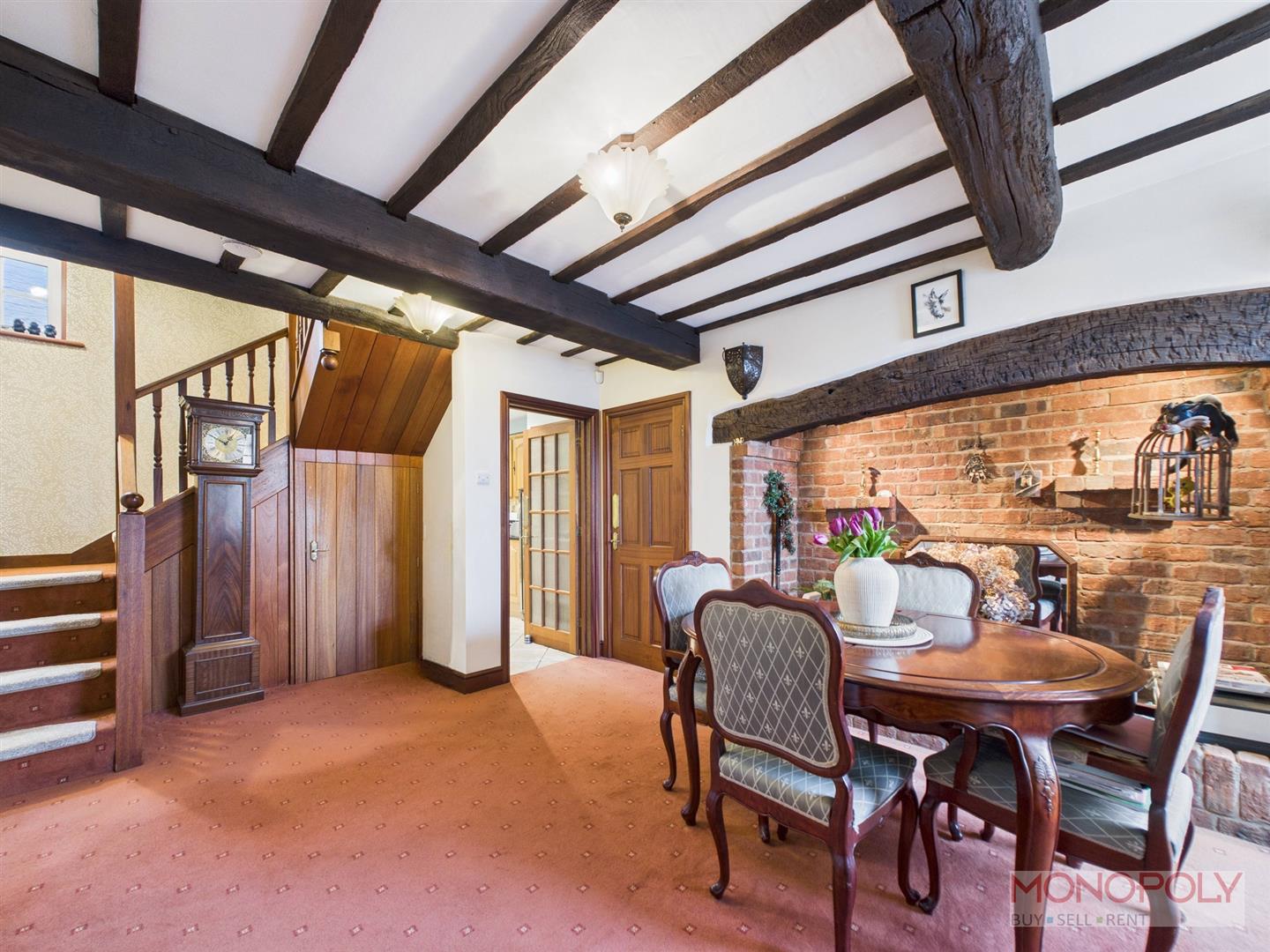 Two ceiling light points, exposed beams to the ceiling, doors off to bathroom and three bedrooms, stairs rising to converted loft space and carpet flooring.