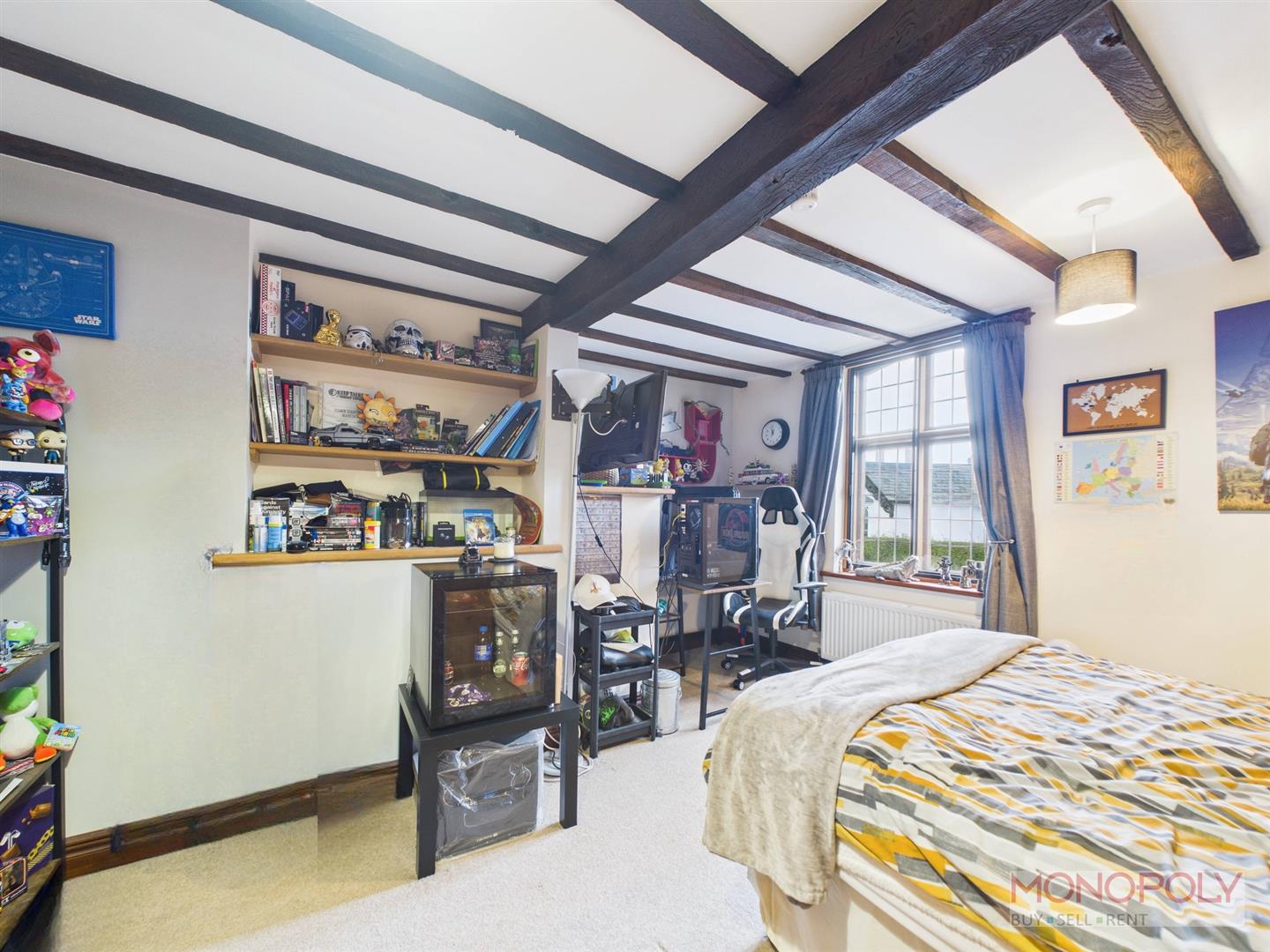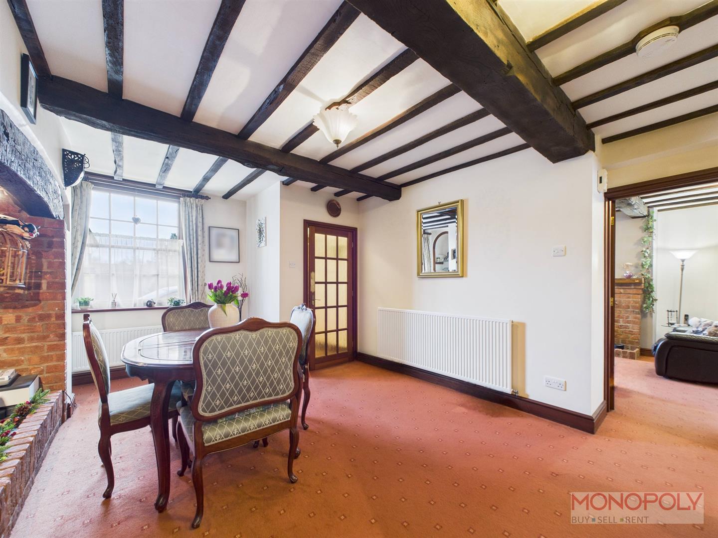 Wooden glazed window with secondary glazed window to the front elevation, beams to the ceiling, radiator and carpet flooring.